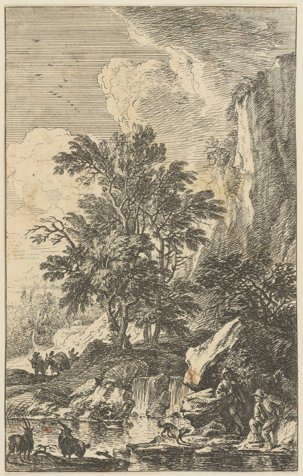 Männer mit Hund und Ziegenböcke am Wasser (Serie: Landschaften)