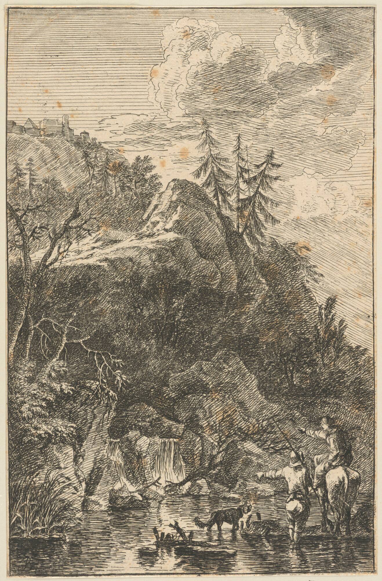 Mann mit Hund und Frau zu Pferd am Fluss (Serie: Landschaften)