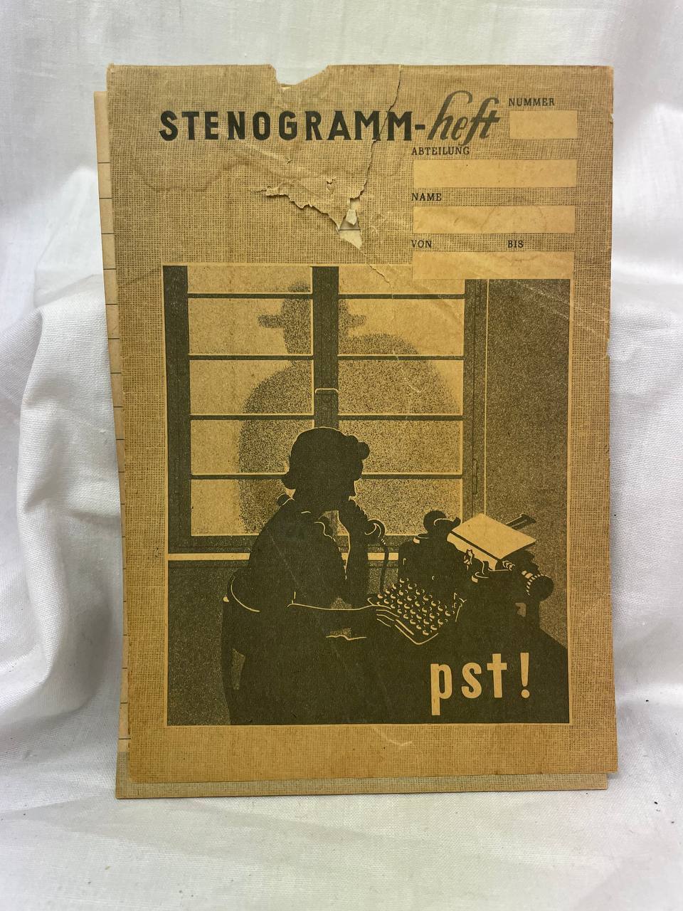 BeschreibungTitelblatt: Sekretärin an Schreibmaschine vor einem Fenster, im Fenster der große Unbekannte als Schatten. Jedes Blatt ist mit einem Ratschlag an die Sekretärin versehen: "Sei stets verschwiegen! Du bist es der Front schuldig" oder "Vernichte gebrauchte Stenogrammhefte vorschriftsmäßig" "Der Papierkorb darf keine Fundgrube für Spione sein", "Schweigen ist Pflicht für alle", "Beachte auch am Fernsprecher: Feind hört mit", "Vorsicht! Der Feind ist überall", "Drei Kriegsgebote: Vorsicht, Gewissenhaftigkeit, Verschwiegenheit"