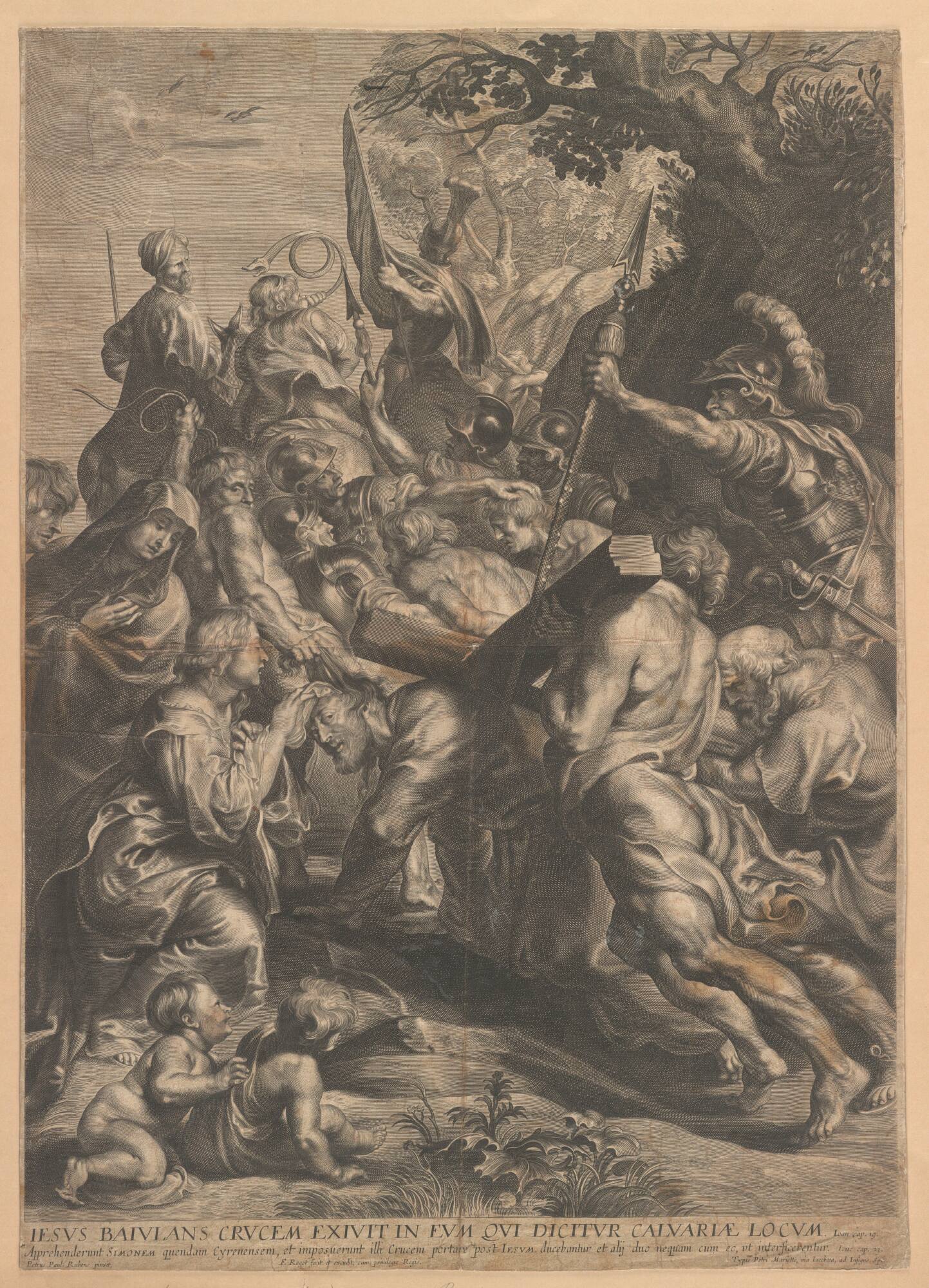 IESVS BAIVLANS CRVCEM EXIVIT IN EVM QVI DICITVR CALVARIAE LOCUM. Ioan. cap. 19. / Apprehenderunt SIMONEM quendam Cyrenensem, et imposuerunt illi Crucem portare post IESVM. ducedantur et alij duo nequam cum eo, ut interficerentur. LuC cap. 23.