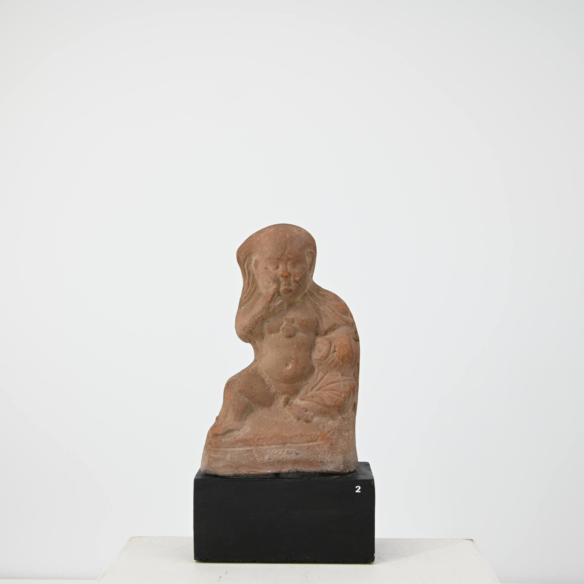 BeschreibungAuf höherer ovaler Basis mit umlaufender Strichlinie kauert der babyhafte Harpokrates, das rechte angewinkelte Bein von sich gestreckt. Der Finger der rechten Hand liegt am Mund, mit der linken hält einen Topf umfaßt, der horizontal auf dem Oberschenkel liegt. Ein Manteltuch, in das lineare, wenig organische Falten eingeritzt sind, bedeckt die linke Schulter und den Schenkel. Ein sog. Herzamulett liegt auf der Brust. Der Körper ist unförmig dick, der Kopf groß und das Gesicht enorm aufgedunsen. Eine ägyptische Jugendlocke steht seitlich vom ansonsten kahlen Schädel ab.MaßeH: 13,6 B: 8,6 T: 4,0