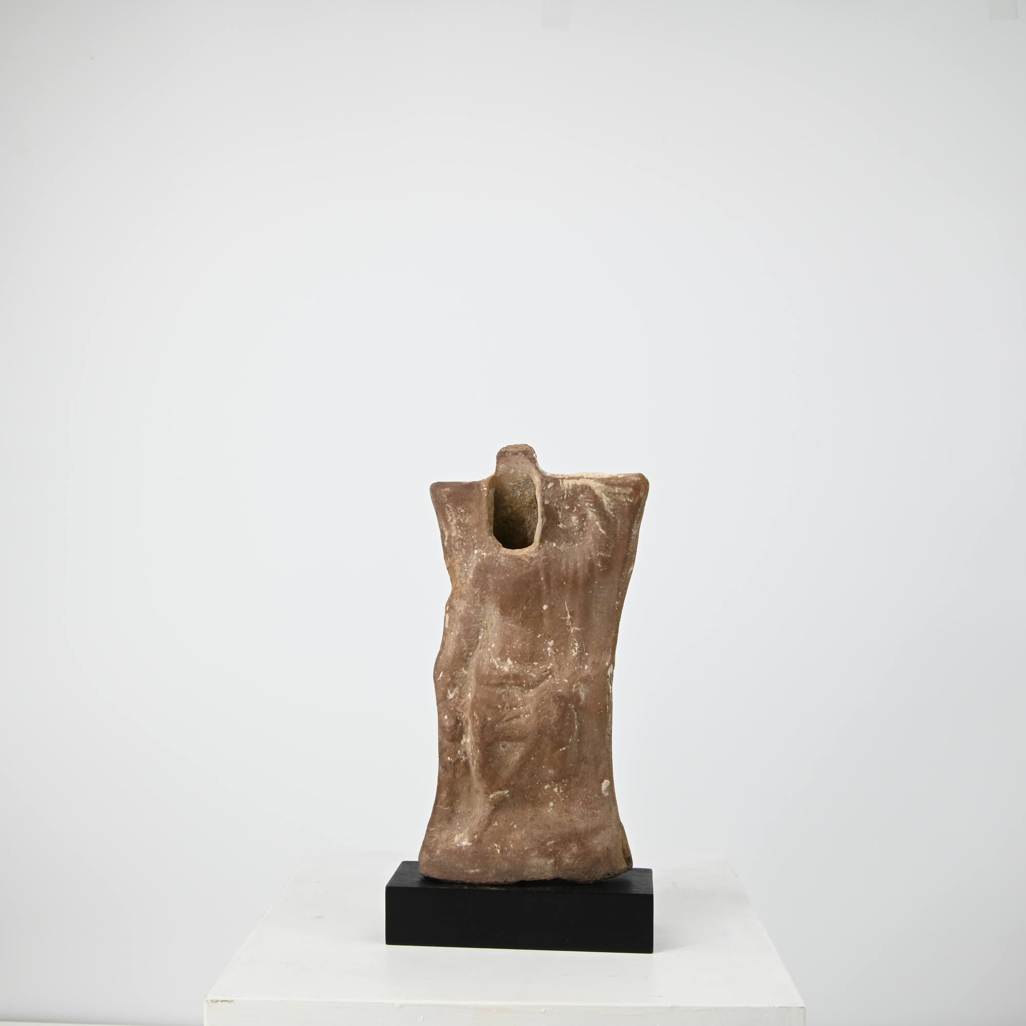 BeschreibungAuf flacher geradliniger Basis thronender Sarapis wie oben Nr. 747. Thron mit hoher, entlang der Kante verzierter Lehne. Schlechte Arbeit von flauer Ausformung.MaßeH 17,0 cm; B (Bas) 8,3 cm; T (Bas) 2,9 cm