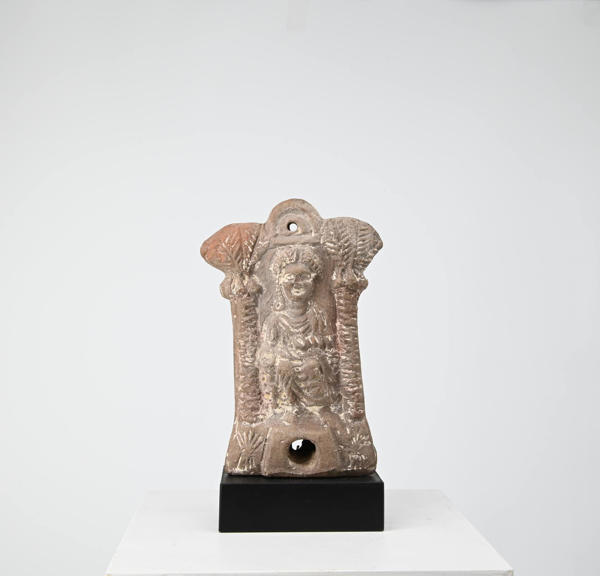 BeschreibungZwischen zwei Palmen, die über Ährenbündeln stehen, sitzt mit angezogenen Beinen eine Frau oder Göttin, die Füße auf ein rechteckiges Podest gestellt, das mit einem großen runden Loch durchbohrt ist. Die Figur ist mit einem langen Chiton bekleidet und einem Isismantel, der unter den Brüsten gerollt ist und dazwischen einen Knoten bildet. Die auf der Brust und zwischen den Beinen durchhängenden Falten von Gewand und Mantelstoff sind mit tiefen Kerben eingeschnitten. In der rechten vorgestreckten Hand hält die Frau eine Phiale, in der auf dem Schoßliegenden linken Hand etwas ähnliches. Der Kopf ist relativ groß, das Gesicht scheint zu lächeln. Die Frisur ist ungewöhnlich: über der Stirn schneiden die in kleine Kompartimente geordneten Haare glatt ab, rechts sind sie zum seitlich herabhängenden Zopf ägyptischer Tradition zusammengedreht.