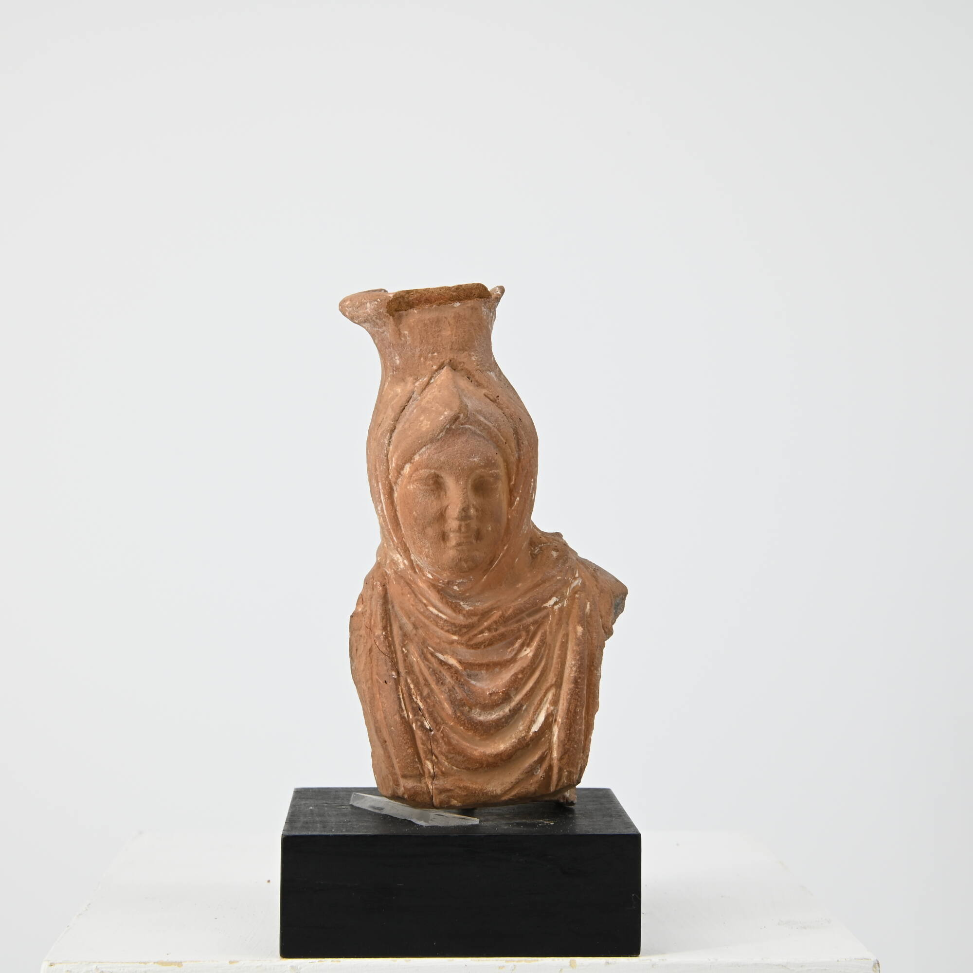 BeschreibungGefäß in Form einer jetzt unten waagrecht abschneidenden Büste, an der die Armstümpfe noch ansatzweise erkennbar sind. Dargestellt ist ein bekleideter Knabe, dessen stoffreich vor der Brust und am Rücken in bogenförmigen Falten durchhängender Mantel seitlich von herabhängenden Streifen (Clavi) begrenzt ist. In Art einer Kapuze ist das Tuch über den leicht zur linken Seite geneigten Kopf gezogen; darüber öffnet sich die Gefäßmündung. Das längliche Gesicht mit hoch sitzenden Wangenknochen hat ein weiches, leicht verschwimmendes Inkarnat, die kleinen Augen blicken aus zart gestalteten Lidern.MaßeH 10,2; B 5,4; T 4,1