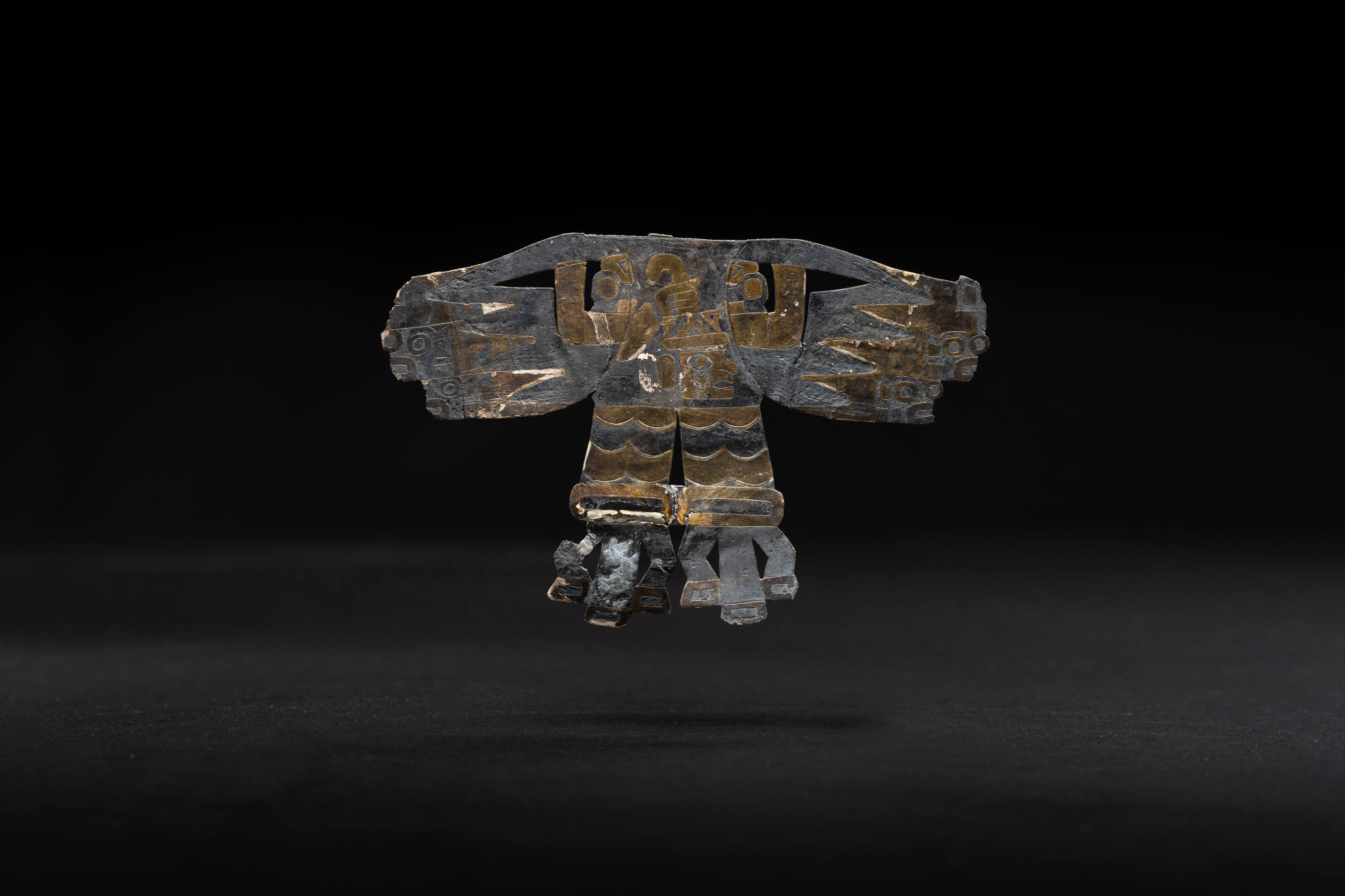 BeschreibungDie Gold- und Silberarbeit zeigt einen gefiederten Vogel mit ausgebreiteten Flügeln, starken Fängen und Krallen, jedoch ohne Kopf, der, wie die raue obere Kante andeutet, wohl abgebrochen ist. Ins Auge sticht, dass man in der Körpermitte des Vogels einen abgeschlagenen Kopf erkennt, der von einer menschlichen Hand am Haar oder Kopfschmuck gehalten wird. Zugleich fallen die Feder-Enden der Handschwingen des Vogels auf, die als Gesichter gestaltet sind. Vor allem die Hand mit Kopftrophäe macht deutlich, dass es sich hier nicht um eine Tierdarstellung, sondern um ein hybrides Wesen, bestehend aus Mensch und Tier, also um das Bild einer Gottheit handelt.Diese Ikonographie lässt an Kultobjekte aus der Chavín-Kultur denken, in der geflügelte Götter mit Kopftrophäen Darstellung fanden. In der Nazca-Kultur findet sich ebenfalls ein „Horrible Bird“ mit Kopftrophäe wie auch bereits in der Vorgängerkultur der Paracas, wo ähnliche Szenerien ins Bild gesetzt wurden. Aus welcher präkolumbischen Kultur dieses Artefakt stammt, bleibt unklar.