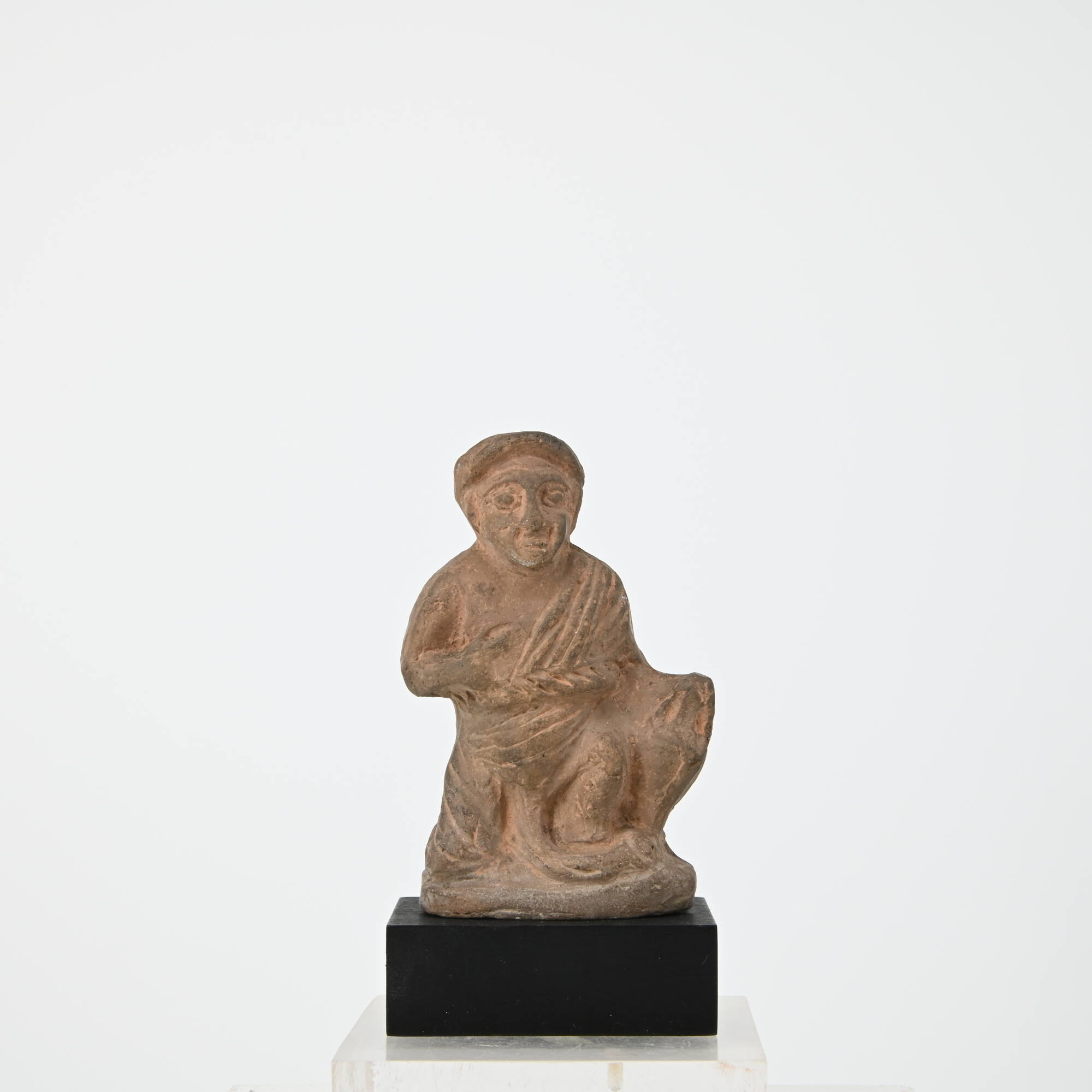 BeschreibungEin bekleideter Mann kauert auf einer flachen runden Basis indem er das linke Bein aufgestellt hat und auf dem rechten kniet. Die rechte Hand liegt mit abgestrecktem Zeigefinger vor der Brust, die linke umfaßt den Hals einer zweihenkeligen Amphore, die leicht schräg neben ihm auf der Basis steht. Der Diener trägt einen Mantel, der von der linken Schulter diagonal vor der Brust liegt und in einer Rolle um den Bauch gewickelt ist. Nur das rechte Bein scheint in den Mantel gehüllt, der lange und dünne Penis liegt unbedeckt vor den linken Fuß geschwungen auf der Basis. Der Mantel ist gänzlich mit parallelen linearen Falten überzogen, selbst der Phallus ist mit Ritzlinien bedeckt. Der Kopf des Dieners hat eine annähernd dreieckige Form, die großen Augen sind maskenhaft umrandet. Ein flacher und glatter Kranz bedeckt die Stirn.MaßeH 9,6 cm B 6,2 T 3,2
