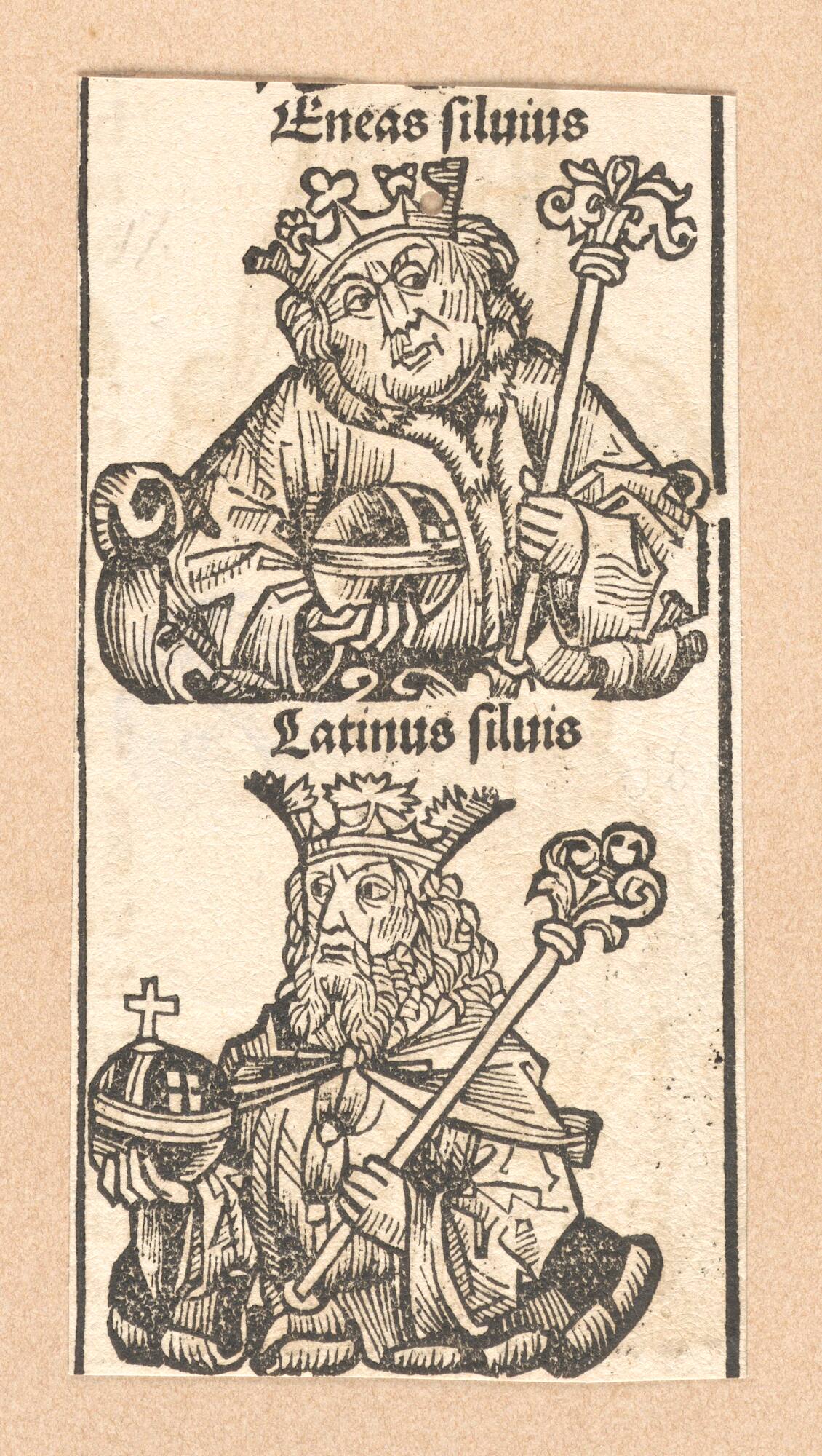 Schedelsche Weltchronik - Herrscherdarstellungen: Eneas silvius, Latinus silvis (049r)