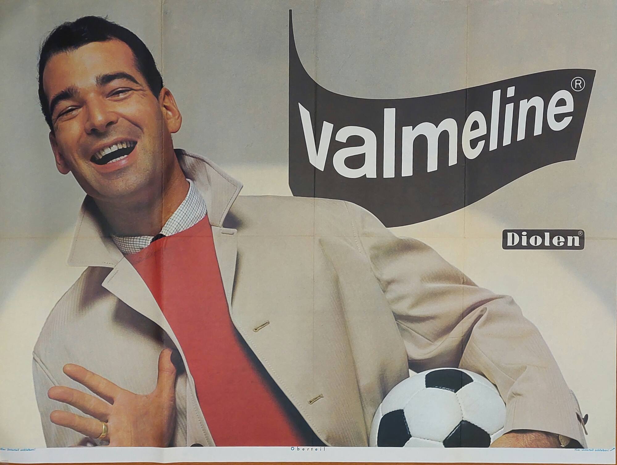 BeschreibungEin zweiteiliges Werbeplakat für einen Herren Anzug der Marke Diolen, welche zu dem Konzern Dralon GmbH gehört. Diese werben mit der Acrylfaser Valmeline für ihre Herrenbekleidung. Auf dem Plakat ist ein Mann in einem beige farbenen Anzug zu sehen, mit einem Fußball unter dem linken Arm. MaßeB x H (Oberteil): 118 x 87 cm