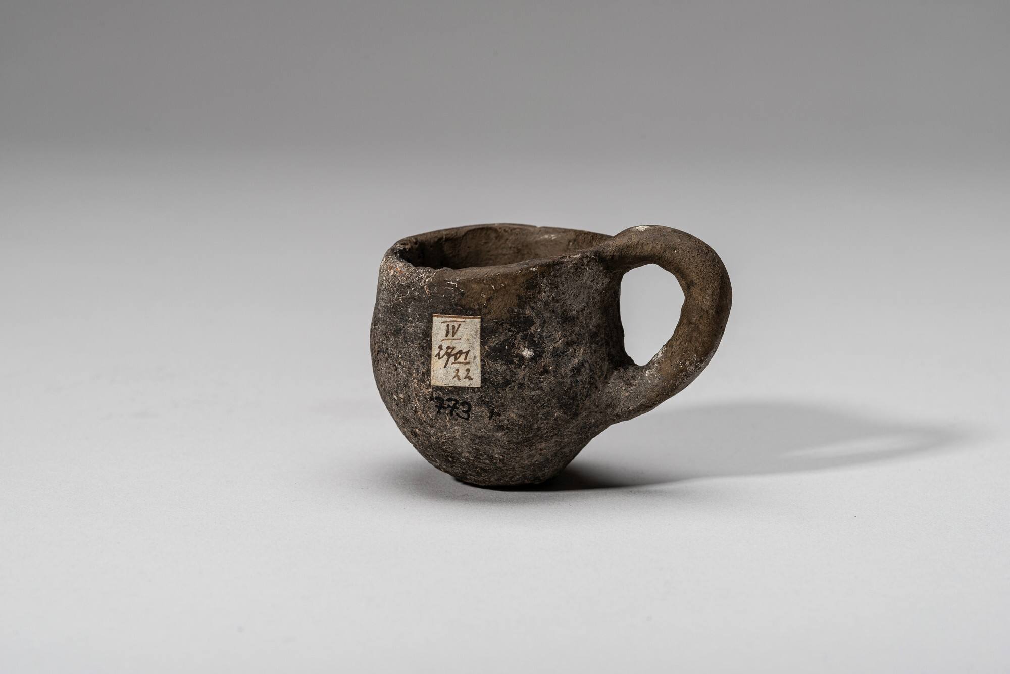 BeschreibungEinhenklige Tasse mit kleiner Standfläche, unregelmäßiger Form und leicht schräger Mündung.Objektnr.KLA-Or-773