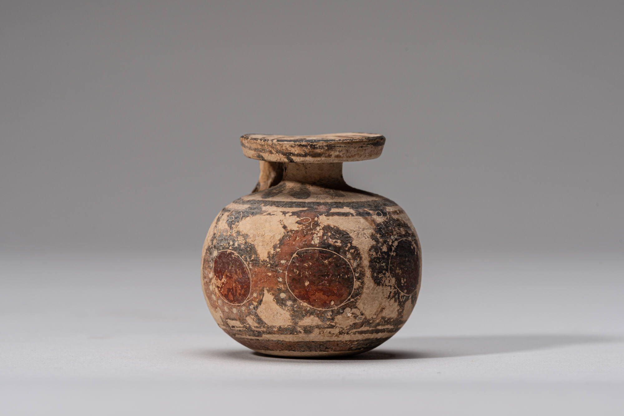 BeschreibungBildzone zwischen je zwei waagerechten Streifen. Drei nach links marschierende behelmte Krieger, bewaffnet mit Schild und Speer. Außer Kopf und Füßen vollständig von den Schilden verdeckt. Zeichnung grob und unförmig. Innenrund der Schilde rot, durch Ritzung begrenzt. Auf dem Schildrand weißer Punktkreis.MaßeH 5,7 cm