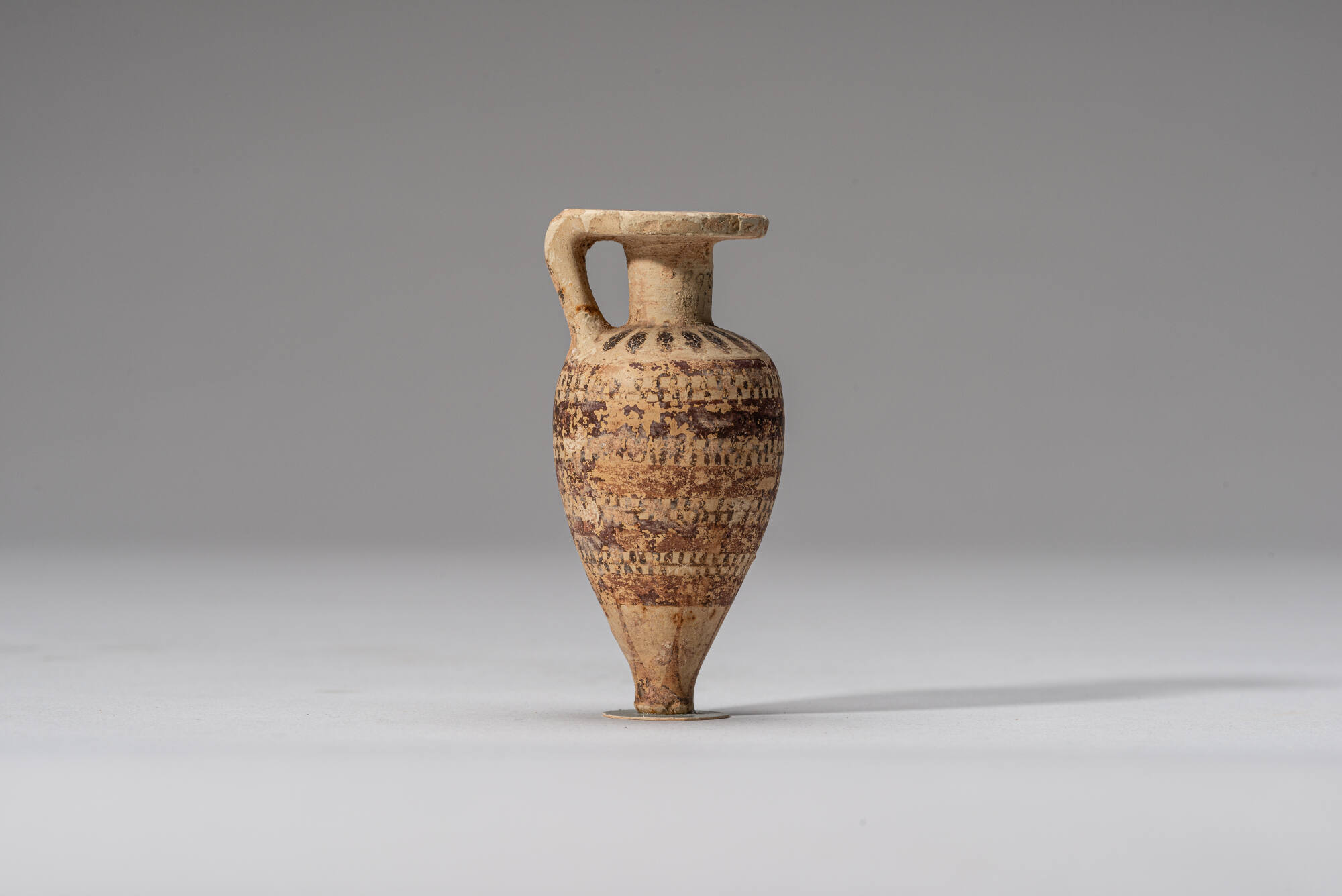 BeschreibungVier doppelte Streifen länglicher Punkte mit feiner Trennungslinie zwischen breiten dunkelroten Bändern. Am Fuß Strahlenkranz. Auf Schulter und Mündungsteller Strahlenkranz. Am Henkel waagrechte Streifen.MaßeH 7,9 cm