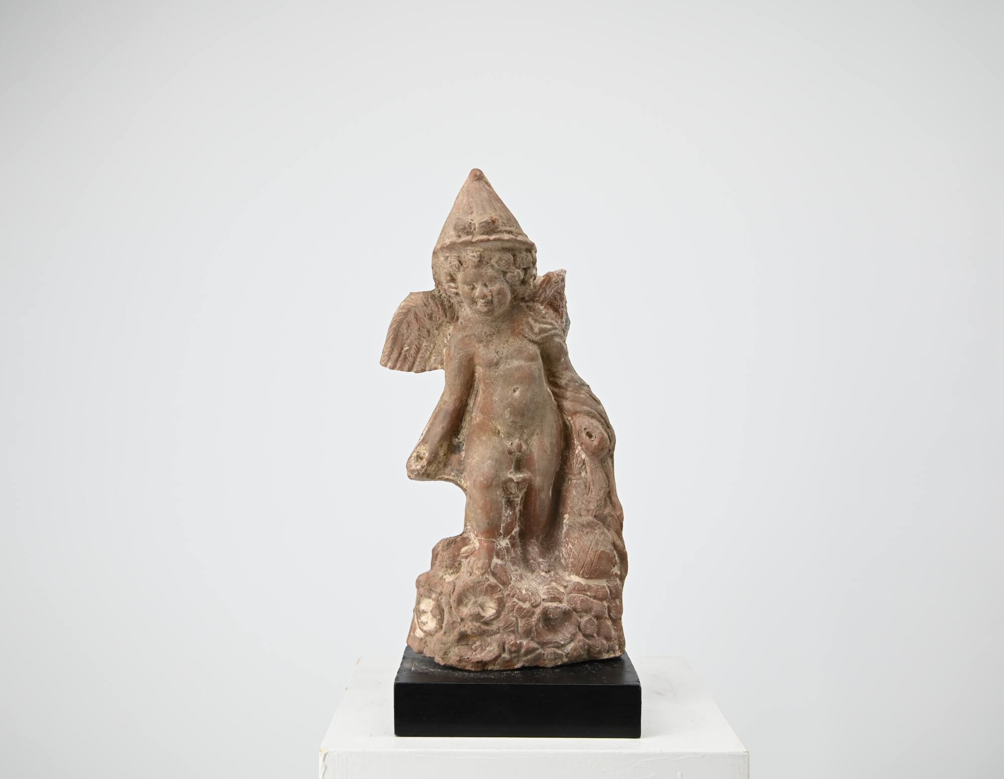 BeschreibungAuf steinigem Untergrund, der mit Muscheln übersät ist, steht ein jugendlicher Eros als Fischer. Er schaut auf seinen rechten Fuß hinab, den er auf den Kopf eines kleinen Delphins gesetzt hat, dessen Schwanzflosse gegen seinen Oberschenkel schlägt. Seine Arme sind leicht vom Körper abgestreckt, in den Fäusten sind Löcher eingetieft, in denen vermutlich eine Angel steckte. Um den linken Arm ist ein Mantel geschlungen, der sich über einen am Boden stehenden Korb ausbreitet, aus dem ein Flosse herausschaut. Der nach vorne gebeugte Kopf des kleinen Got-tes ist von einer dicht gelockten Haarmasse umgeben, darauf sitzt ein spitzer Hut, auf dem zwei kleine Lotosknospen mit einem Band befestigt sind.MaßeH 18,9 cm; B 8,3 cm; T 4,5 cm