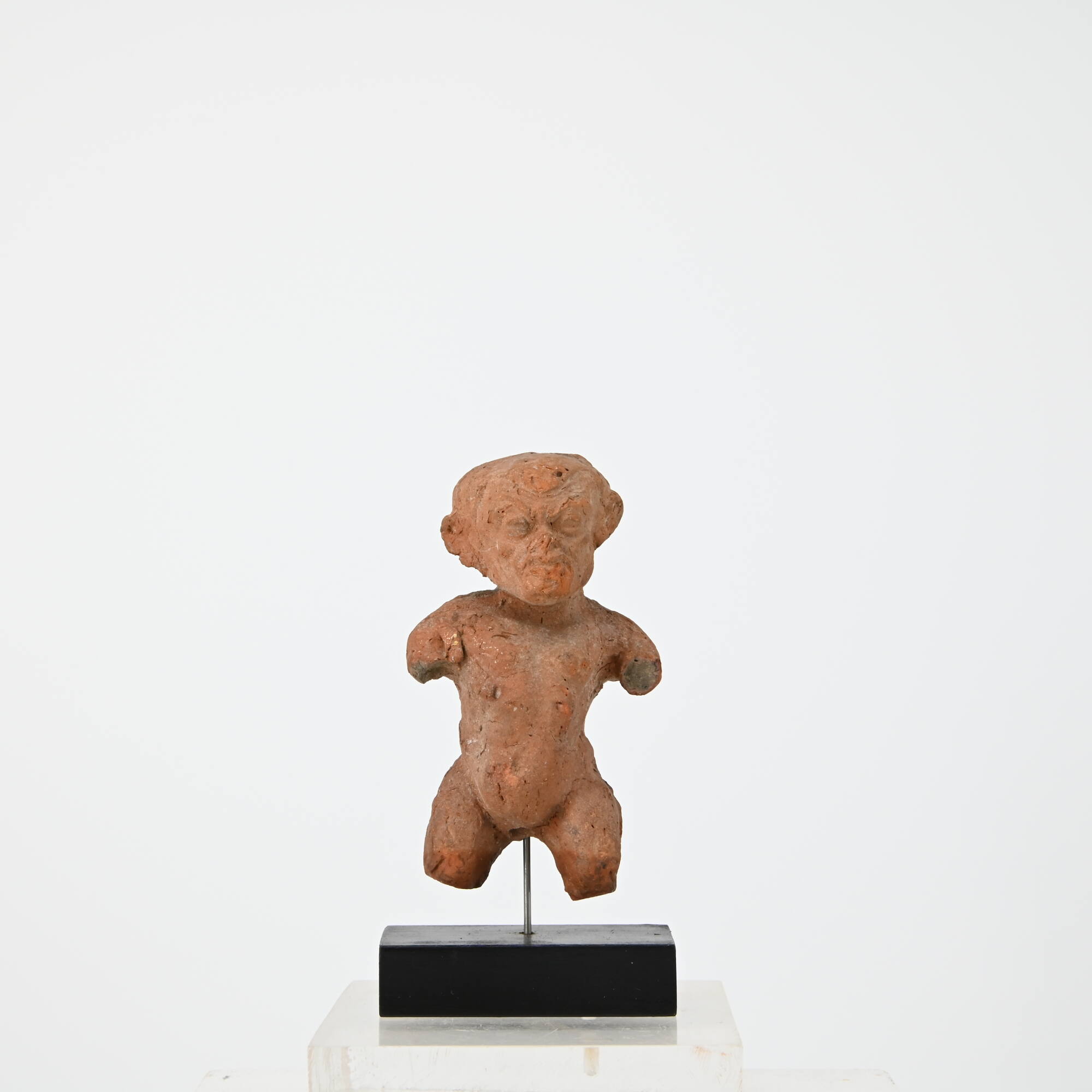 BeschreibungVollplastische Figur eines nackten Pygmäen mit kurzen Stummelbeinen, die er zum Gehen weit gespreizt hat. Der Oberkörper ist leicht nach links gedreht, die Schulter zurückgenommen. Beide Arme waren, leicht erhoben, vom Körper weggestreckt. Der feste und kugelige Bauch wölbt sich stark vor, das dralle Gesäß ist durch den knieweichen Stand nach hinten hinausgeschoben. Entlang der Wirbelsäule sind mehrere Muskelpakete angegeben. Der große Schädel hat einen auffallend breiten und hohen Hinterkopf, sowie eine hohe, beinahe rechteckige Stirn. Die Haut liegt dünn und zerfurcht über dem knochigen Gesicht. Die hohe höckrige Stirn, die wulstigen Augenbrauen, die kurze und eingedellte Nase, über der sich steile Falten eingegraben haben, sowie die eingefallenen faltigen Wangen zeigen deutlich, daß es sich bei dieser Figur um einen Pygmäen handelt.MaßeH 9,3 cm; B 5,5 cm; T 3,8 cm