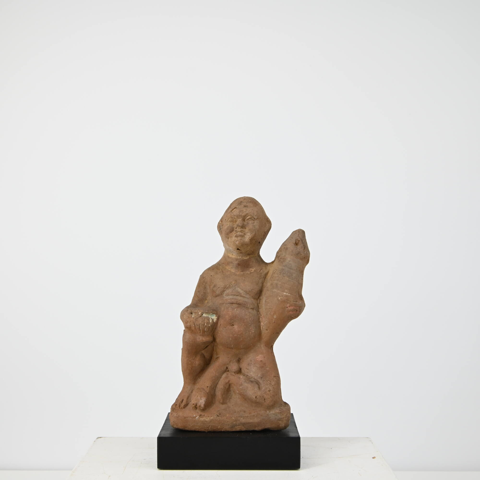 BeschreibungAuf 0,9 cm hoher, vorne glatter und hinten halbrunder Basis kauert ein nackter Diener mit kugeligem Bauch, hängenden Brüsten und Speckfalten. Er hat das rechte Bein angewinkelt aufgestellt, das linke untergeschlagen; dazwischen liegt ein wenig schräg der große Penis. Die rechte Hand des Dieners liegt auf seinem aufgestellten Knie und umfasst den Henkel eines gerippten Kantharos, im linken Arm hält er eine Spitzamphore mit langem, waagrecht gerieftem Körper und spitzem Deckel. Der kahle Kopf ist rund und breit, Kinn und Wangen sind äußerst fett. Er sitzt merkwürdig steif auf dem Körper, vermutlich wurde er nachträglich angestückt.MaßeH 15,8 cm; B 7,9 cm; T 5,7 cm