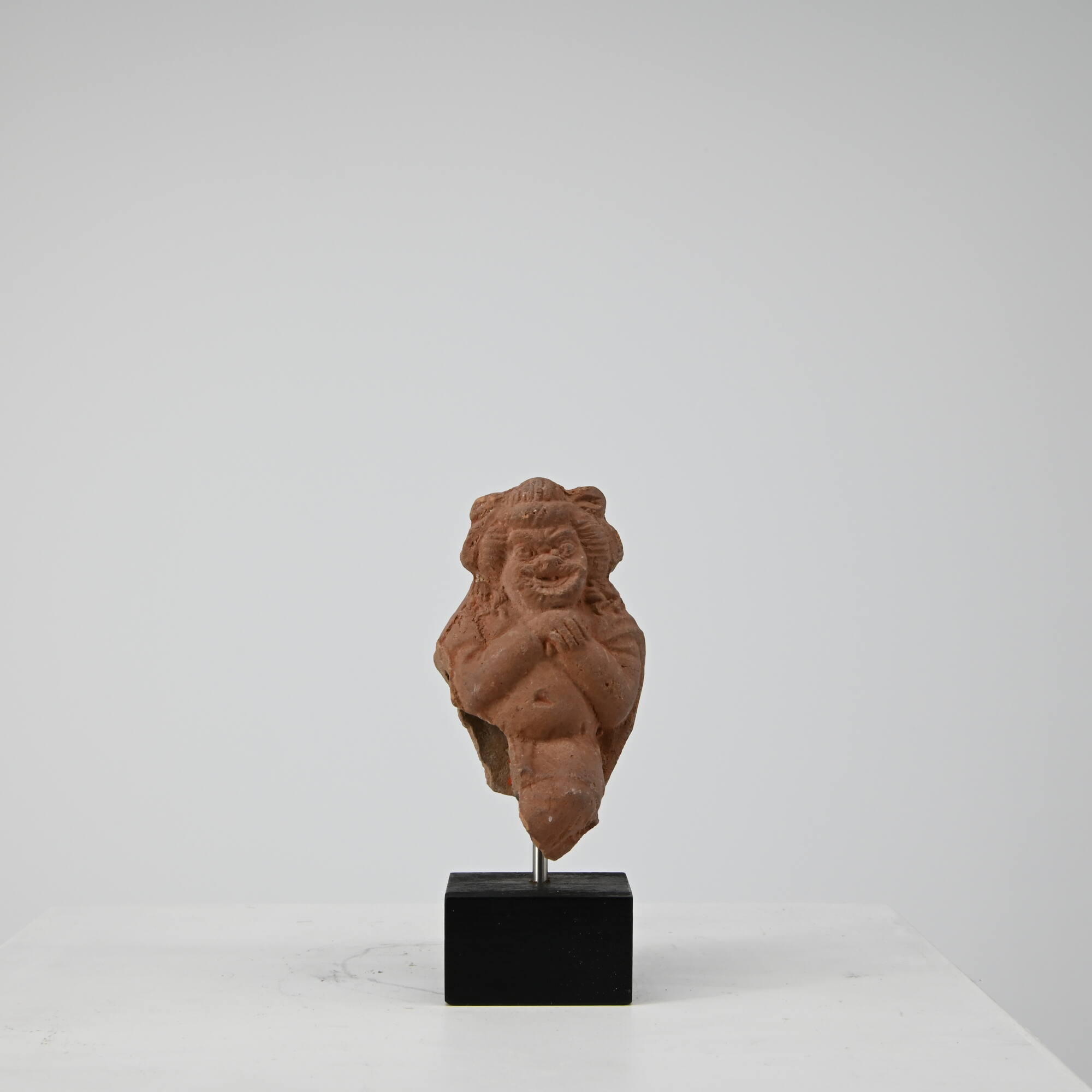 BeschreibungEin maskierter Schauspieler stützt ausruhend sein Kinn auf die vor der Brust verschränkten Hände. Er sitzt ruhig auf einem (nun weggebrochenen) Sitz, eventuell auf einem Altar, mit wahrscheinlich überkreuz gelegten Beinen. Er ist mit einem enganliegenden Trikot bekleidet, das den Bauch wie nackt erscheinen läßt, dessen Bündchen aber am Handgelenk zu sehen sind. Außerdem trägt er einen Schurz, der mehrere Falten wirft, und dessen zusammengebundene Enden zwischen die Oberschenkel herabfallen. Die Schultern werden von einem Tuch bedeckt, das im Rücken seitlich gerade herabhängt. Der Kopf ist mit einer Sklavenmaske der Neuen Komödie bedeckt: Über dem mondsichelförmigen Mund mit tiefem Schalloch und eingeritzten Barthaaren stößt die platte Nase keck hervor. Die gebohrten Augen sind groß und liegen unter stark gewölbten Brauenbögen. Die massigen, mit Strichen gegliederten Haare sind nach hinten genommen, fallen aber seitlich auf die Schultern. Ein schmächtiger Kranz, seitliche Blüten und Tänien bekrönen die Maske.MaßeH 7,2 cm; B 4,1 cm; T 3,9 cm
