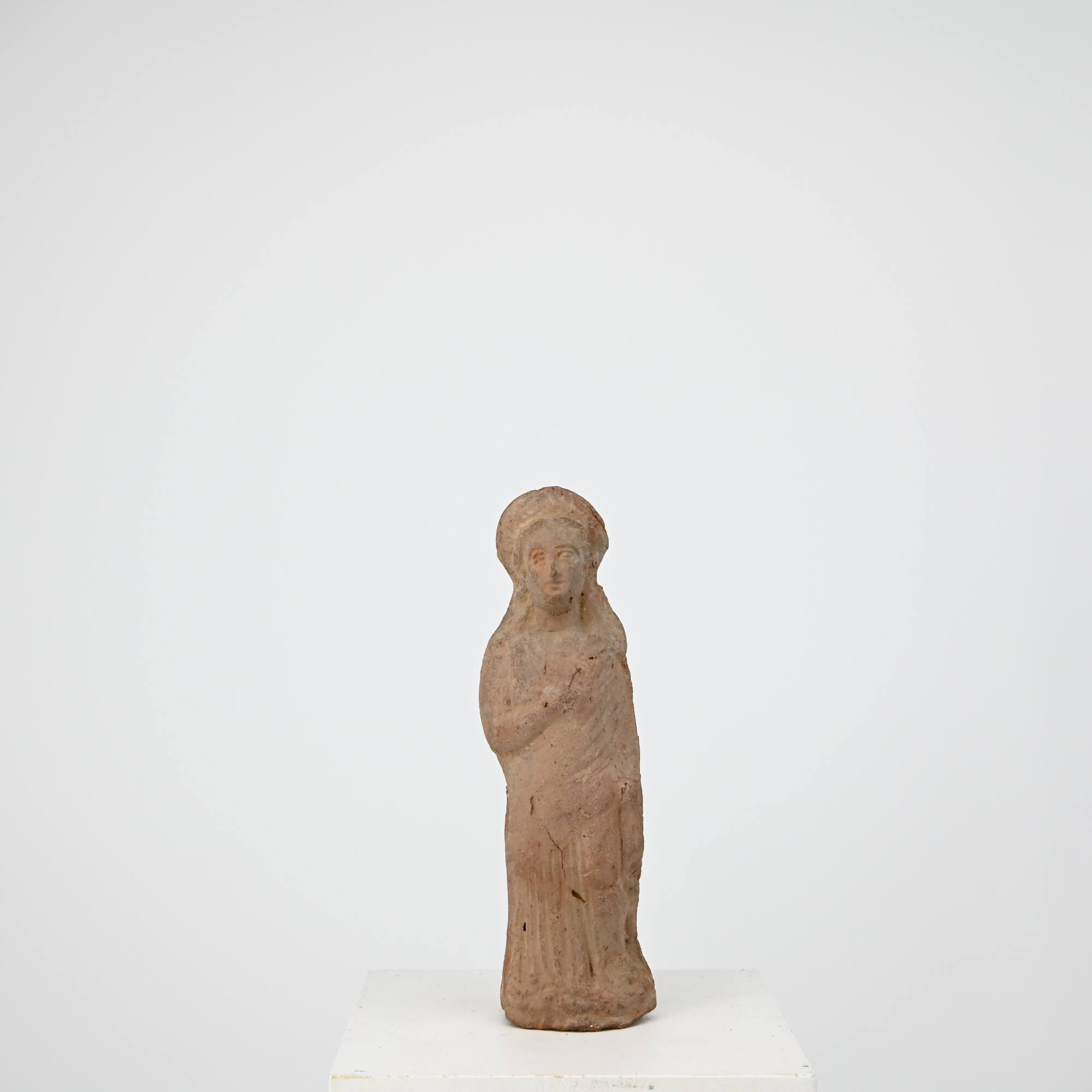 BeschreibungStatuette einer Frau in Chiton und kurzem Mantel, das linke Bein entlastet zur Seite gestellt, das rechte unter dem Chiton nicht sichtbar. Tonnenförmige Gestalt mit linear aufgefaßten, eingeritzten Gewandfalten. Der Mantel führt schalartig und glatt gezogen von der linken Schulter unter die rechte Achsel. Der nackte rechte Arm liegtangewinkelt vor der Brust, der linke hängt vom Mantel verdeckt seitlich gerade herab. Auf dem übergroßen Kopf sitzt ein breiter Kranz, Bindenenden fallen auf die Schultern herab.
