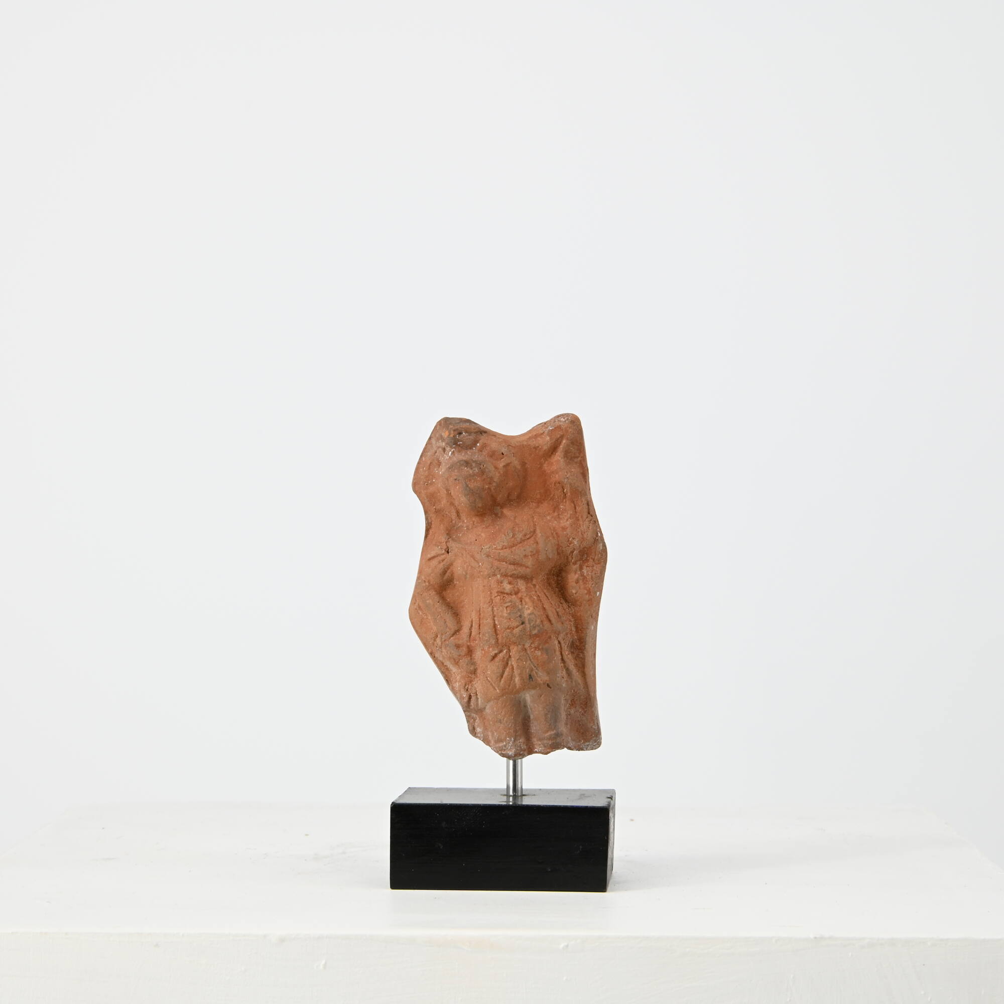 BeschreibungDioskur im kurzen Chiton mit hüftlangem Überfall, darüber ein an der rechten Schulter gefibelter Mantel, der über die linke Schulter auf den Rücken geworfen ist, und mit bis ans Knie reichenden Stiefeln. Er wendet den Kopf nach rechts und blickt auf ein Schwert, das er mit Spitze nach oben im angewinkelten Arm hält. Mit der linken erhobenen Hand umgreift er einen scheinbar gebogenen Stab. Das Gesicht wird von langen gelockten Haaren umspielt, ein breiter Kranz umrahmt den Kopf. Über dem Scheitel ist ein Mittelemblem, vermutlich ein Stern, befestigt.MaßeH 6,5 cm; B 3,8 cm; T 2,3 cm