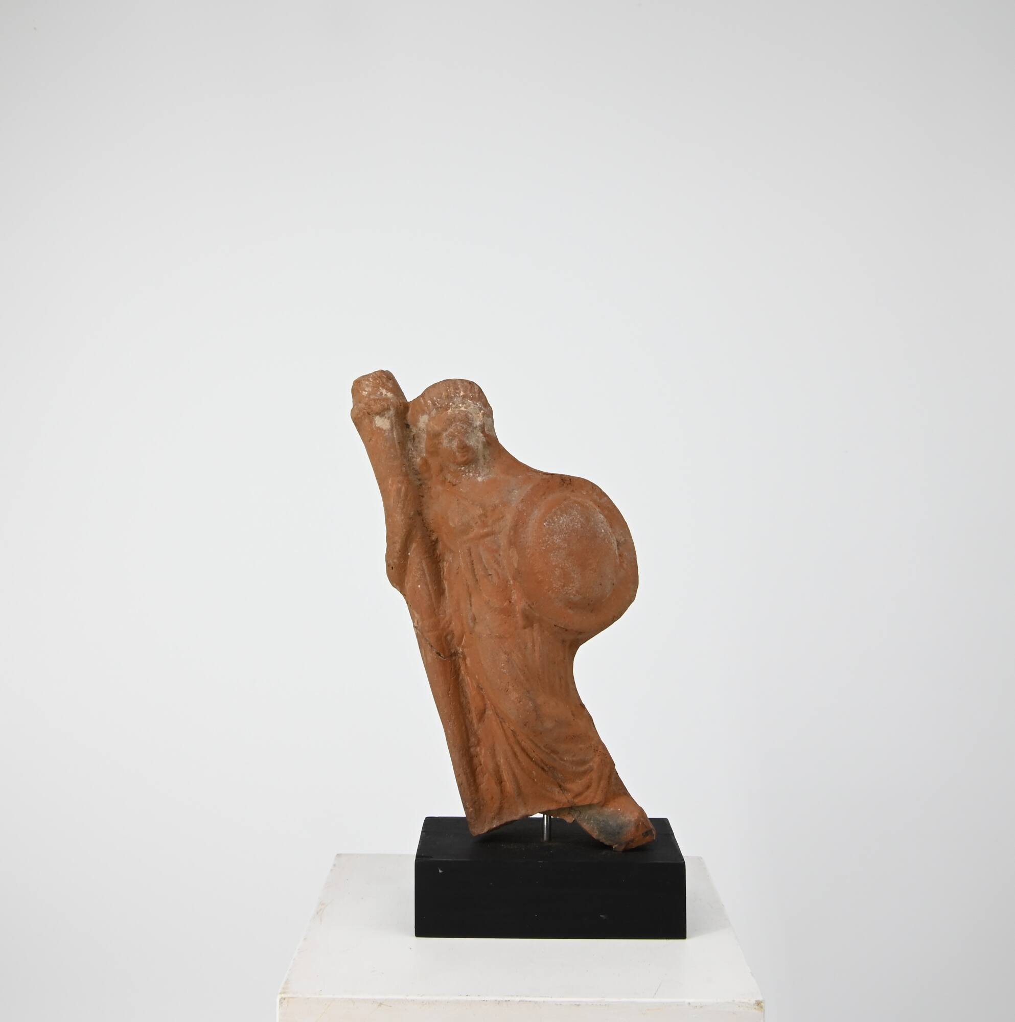 BeschreibungAthena-Neith steht mit überkreuzten Beinen, das rechte über das linke geschlagen, und stützt sich auf eine große Fackel, die sie mit dem rechten Arm umfängt. An der linken Seite hält sie einen runden Schild mit breitem abgesetztem Rand. Sie ist mit einem Peplos bekleidet, der an den Schultern mit runden Fibeln geschlossen ist und in einem Überschlag bis an die Hüften reicht. Unterhalb der Brüste ist er gegürtet; an der offenen rechten Seite fällt der Saum in Zickzackfalten. Der Stoff, der in rund gebogten Röhrenfalten hängt, ist als dick und weich gekennzeichnet. Das kleine Köpfchen der Göttin ist mit einem großen strahlenförmigen Diadem geschmückt, unter dem ihre langen und üppigen Haare hervorquellen. Athena Neith, die in Sais ihr zentrales Heiligtum hatte, wo Lichtfeste eine besondere Rolle spielten, Die Identifizierung von Athena mit Neith beschreibt schon Herodot (II, 59). Fackelhalter.MaßeH 11,8 cm; B 8,5 cm; T 4,6 cm