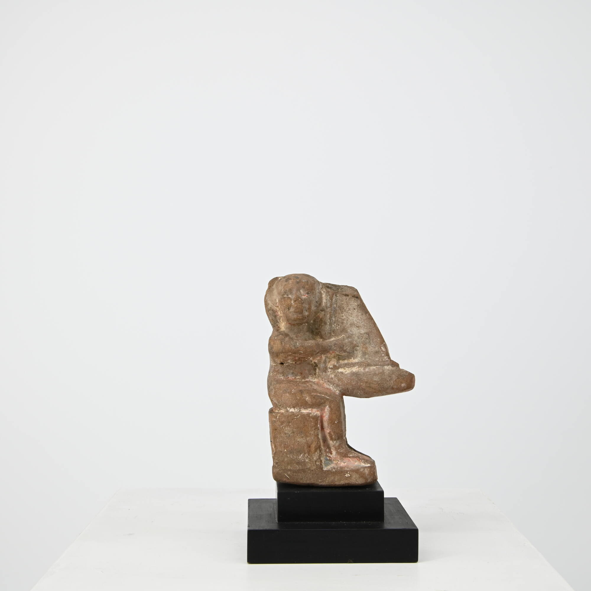 BeschreibungAuf einem Würfelhocker sitzendes Figürchen im Profil, das Trigonon spielt, den Kopf dem Betrachter frontal zugewandt. Die Arme sind waagrecht nach vorne gestreckt, wo sie in die als durchgehende Fläche gestalteten Saiten eines Trigonons greifen, das auf dem großen, waagrecht abstehenden Penis aufsteht. Die Füße ruhen auf einer Basis bzw. einem Schemel. Der Ägypter trägt ein glatt anliegendes, langes Gewand, dessenSaum in Knöchelhöhe sichtbar ist. Der massive Schädel ist breit, an seiner rechten Seite steht eine geschweifte Jugendlocke ab.