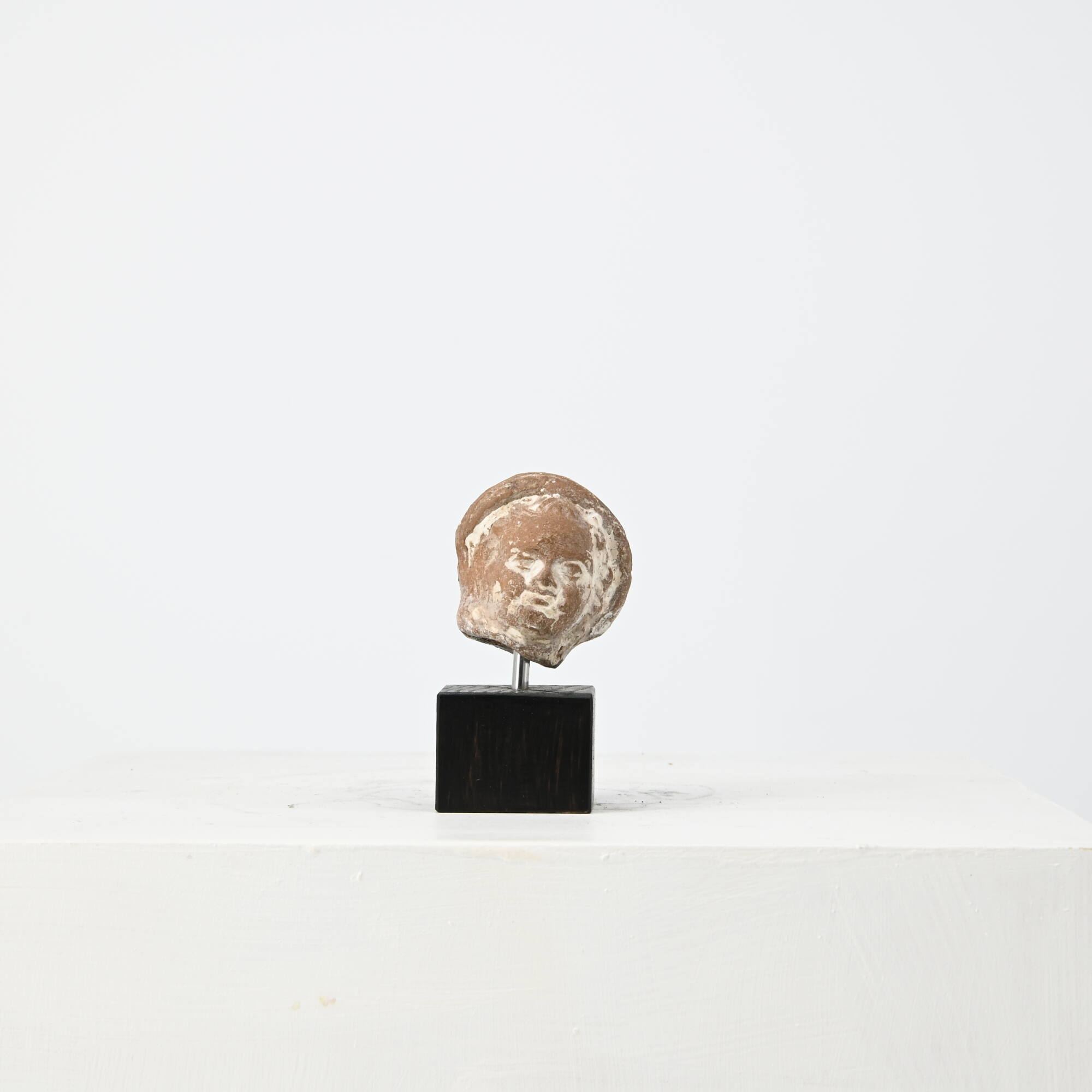 BeschreibungNach unten blickendes Knabenköpfchen, sehr wahrscheinlich zu Apollonstatuette gehörig, da Ton, Technik und Stil zusammenpassen. Kindliches rundes Gesicht mit kleiner Stupsnase und hoher glatter Stirn. Die langen Haare sind über der Stirn zurückgekämmt, wo sie hinter einem schmalen Kranz zu einem Schopf zusammengefaßt sind. Seitlich fallen sie lang herab.MaßeH 3,5 cm, B 3,4 cm, T 3,2 cm