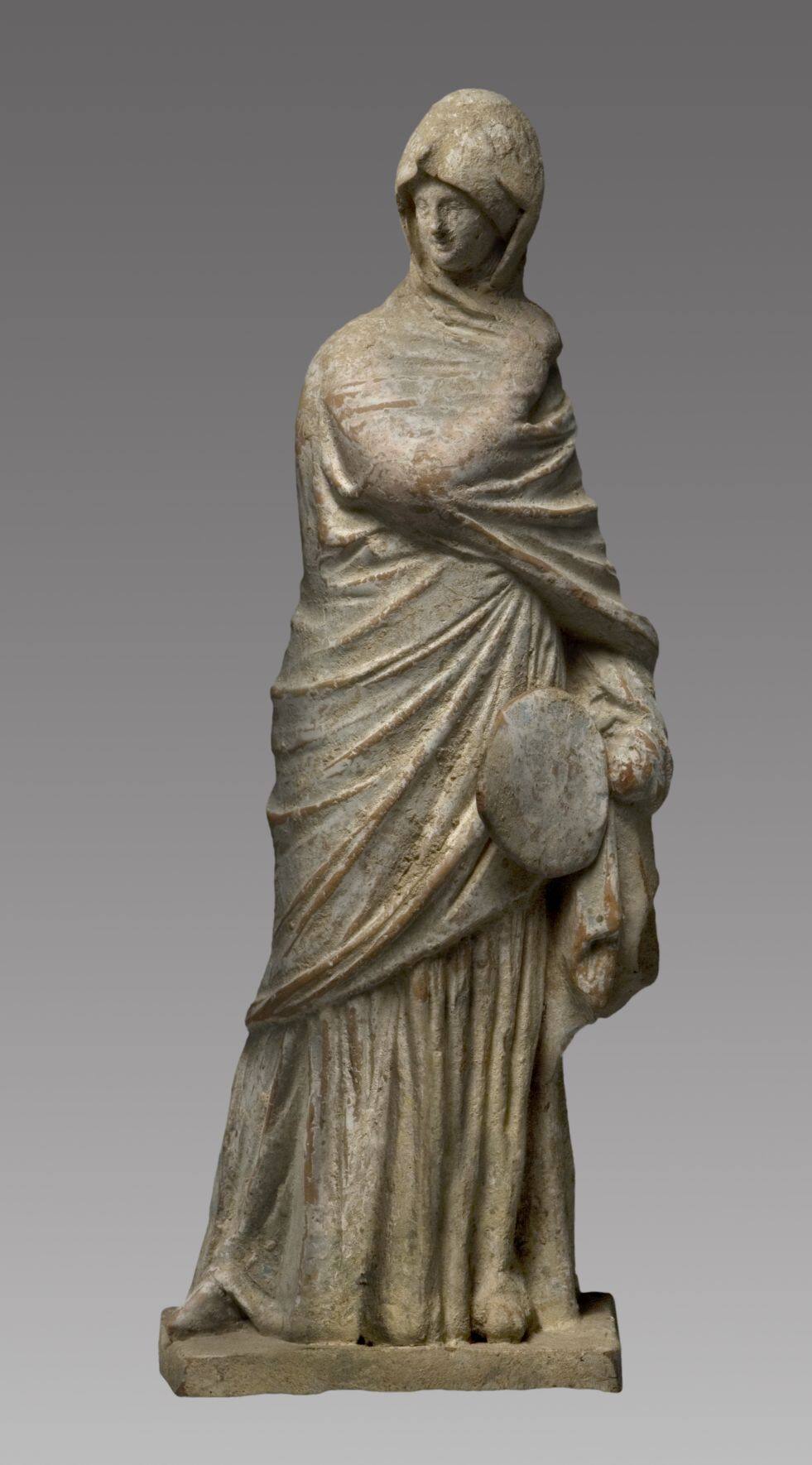 DescriptionDie junge Frau trägt einen bodenlangen Chiton und einen knielangen, über den Kopf gezogenen Mantel. Das Körpergewicht der Figur ruht auf dem linken Bein, der Kopf ist zum Spielbein gewendet, die linke Hand hält einen großen blattförmigen Fächer und die rechte Hand ist unter dem Mantel zur linken Schulter geführt. Seit ihrem Eingang in die Tübinger Sammlung wurde die Mantelfigur verdächtigt, eine der zahlreichen modernen Fälschungen zu sein, die aufgrund der Beliebtheit der Statuetten vor allem im späten 19. Jahrhundert gefertigt wurden. Aus dieser Zeit stammt auch die Bezeichnung dieser Terrakotten als 'Tanagräerinnen' nach einem wichtigen frühen Fundort, der griechischen Stadt Tanagra. Unsere Statuette konnte erst die naturwissenschaftliche Analyse im sog. Thermolumineszenz-Verfahren vom Makel des Zweifels befreien und ihre antike Entstehung nachweisen.DimensionsHöhe: 26,3 cm (263 mm)