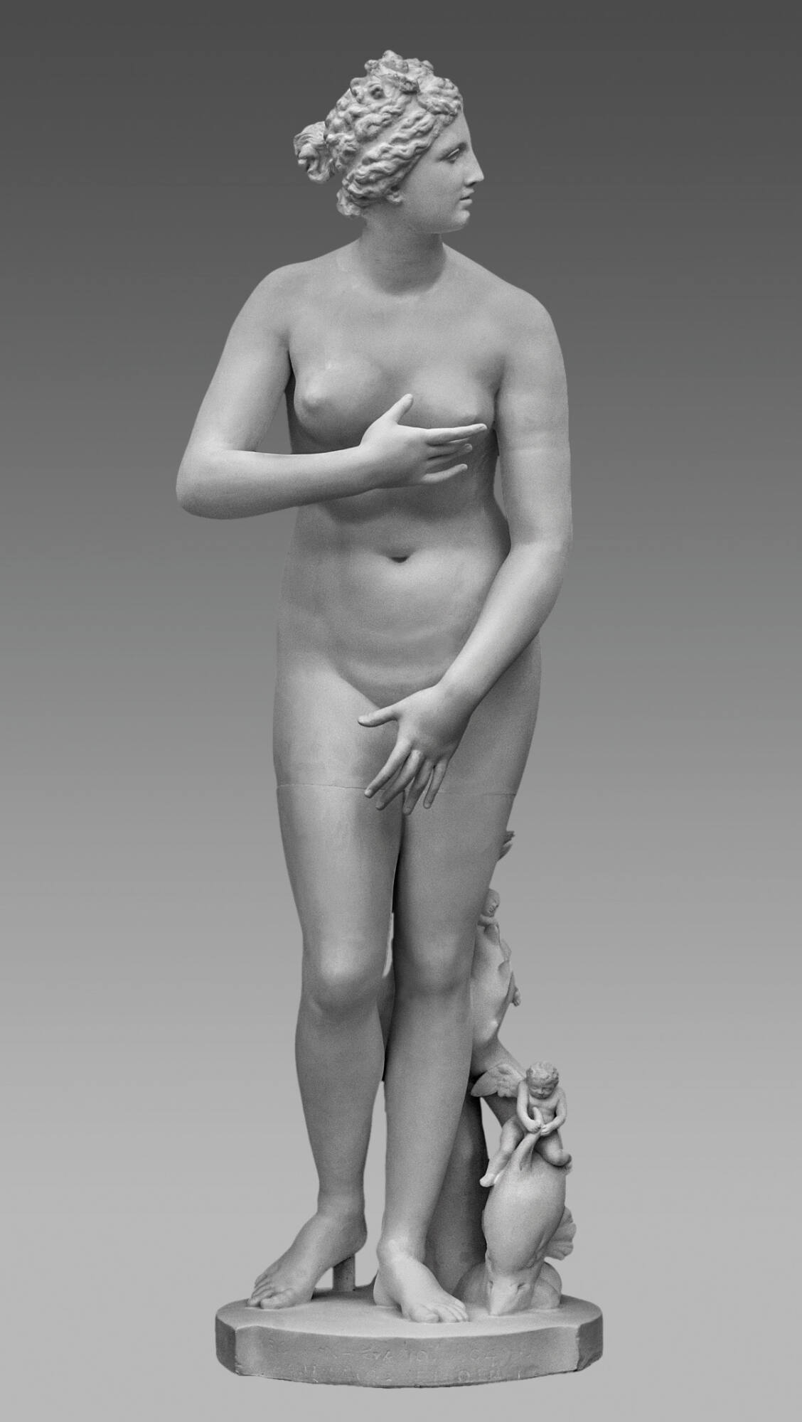 DescriptionDie Beliebtheit der seit der Renaissance bekannten Aphrodite oder Venus Medici klingt nach 1820 stark ab, als ihr mit der neugefundenen Venus von Milo eine starke Konkurrentin erwächst, die obendrein einen Fundort in Griechenland vorweisen kann. Heute betrachtet man die in die Sammlung der Medici eingegangene Statue der Liebesgöttin als späthellenistische Schöpfung eines in Rom ansässigen Künstlers, der sich mit spätklassischen Darstellungen der Göttin auseinandersetzte und den ursprünglichen Schamgestus der Schaumgeborenen in eine gelockerte Form brachte. Die markante Kopfwendung zur Seite (die Haare trugen ursprünglich eine Vergoldung, die Lippen waren rot eingefärbt) erlaubt dem frontalen Betrachter, den nur unzureichend bedeckten Frauenkörper in Augenschein zu nehmen, ohne selbst dem Blick der Göttin ausgesetzt zu sein. Die auf der Plinthe aufgebrachte Inschrift ΚΛΕΟΜΕΝΕΣ ΑΠΟΛΛΟΔΩΡΟΥ ΑΘΕΝΑΙΟΣ ΕΠΩΕΣΕΝ ("Kleomenes von Athen, Sohn des Apollodoros hat dies gemacht.") ist neuzeitlich, ersetzt aber eine gleichlautende antike Inschrift, die ursprünglich wohl auf der Stützfigur des Delphins aufgebracht war.Object numberKLA-Gi-8