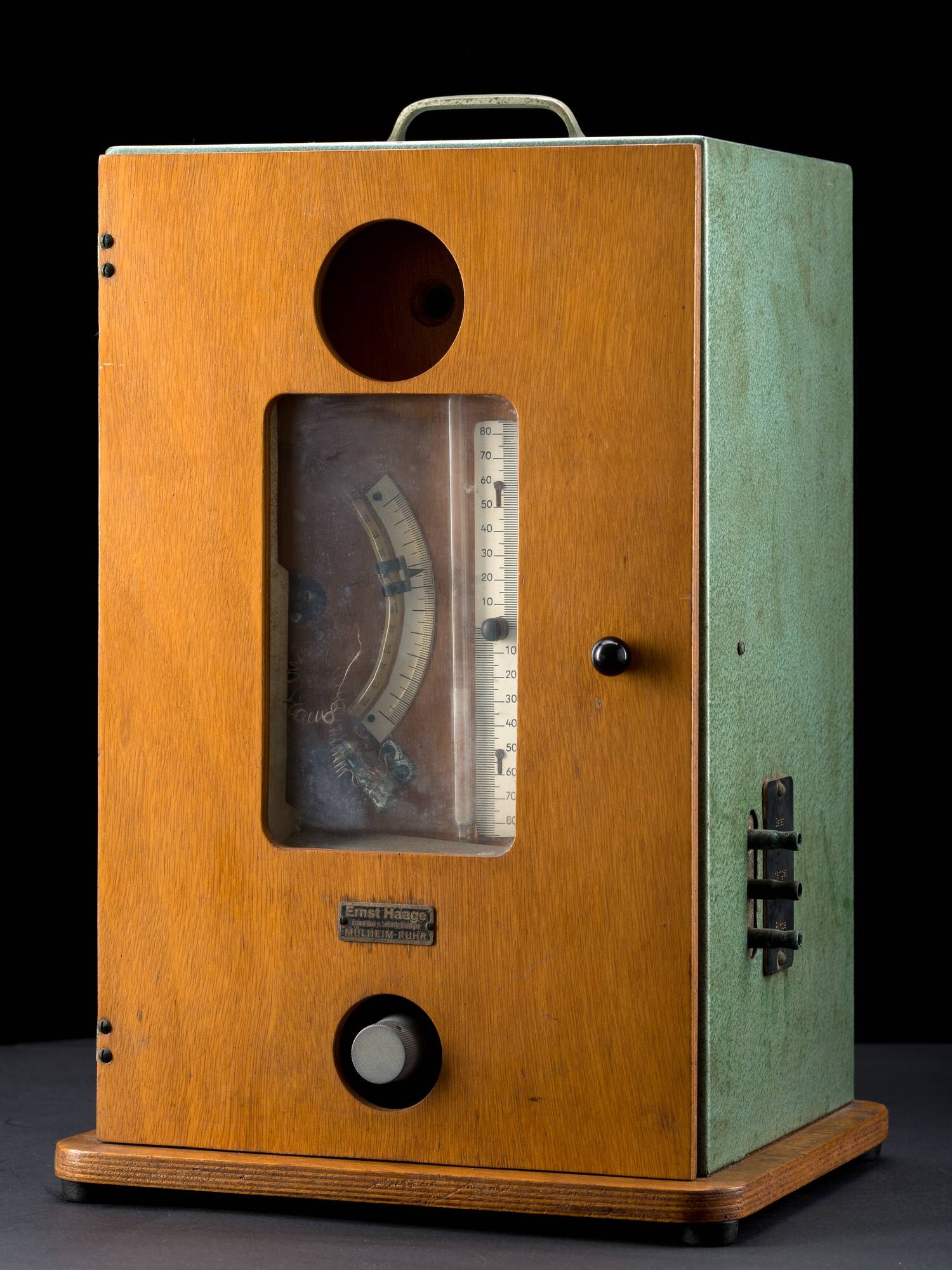Im Gehäuse sind ein Quecksilbermanometer und ein schwenkbares Kontaktmanometer mit Feineinstellung zur Vakuumregulierung montiert, das sich die Firma Haage 1958 patentieren ließ.