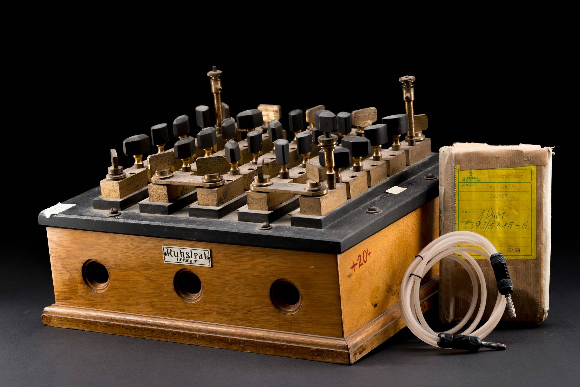 Der Rheostat, ein variabler elektrischer Widerstand, wurde 1840 von dem britischen Physiker Charles Wheatstone entwickelt. Das 1888 gegründete Göttinger Unternehmen Ruhstrat stellte den Stöpselrheostaten im Jahr 1903 her. Er besteht aus vier Reihen von Manganin-Widerständen (Markenname einer Kupfer-Nickel-Mangan-Legierung),