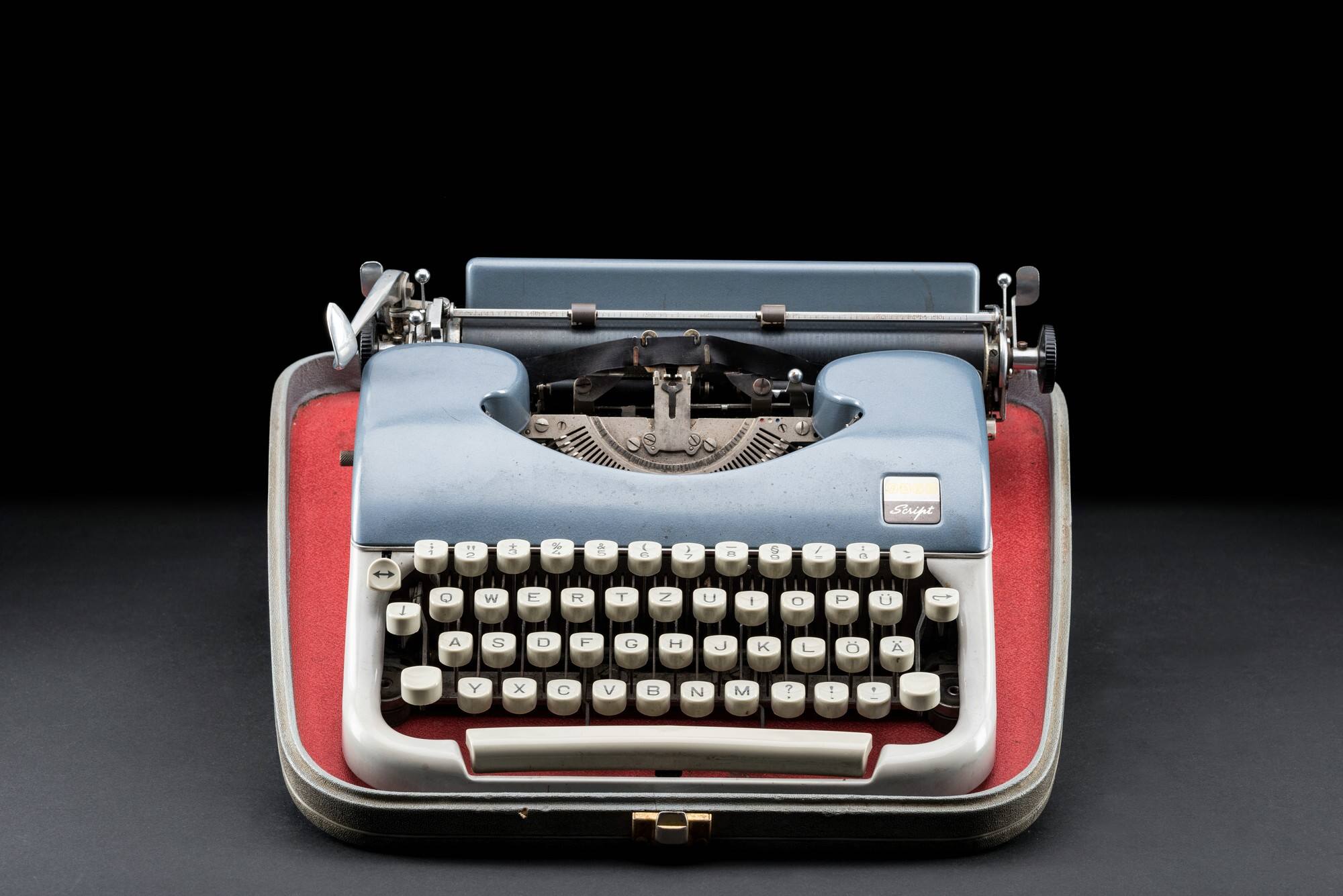 DescriptionBlaugraue, mechanische Schreibmaschine mit deutscher Tastatur und einem Köfferchen.Dimensions15 x 35 x 40 cm