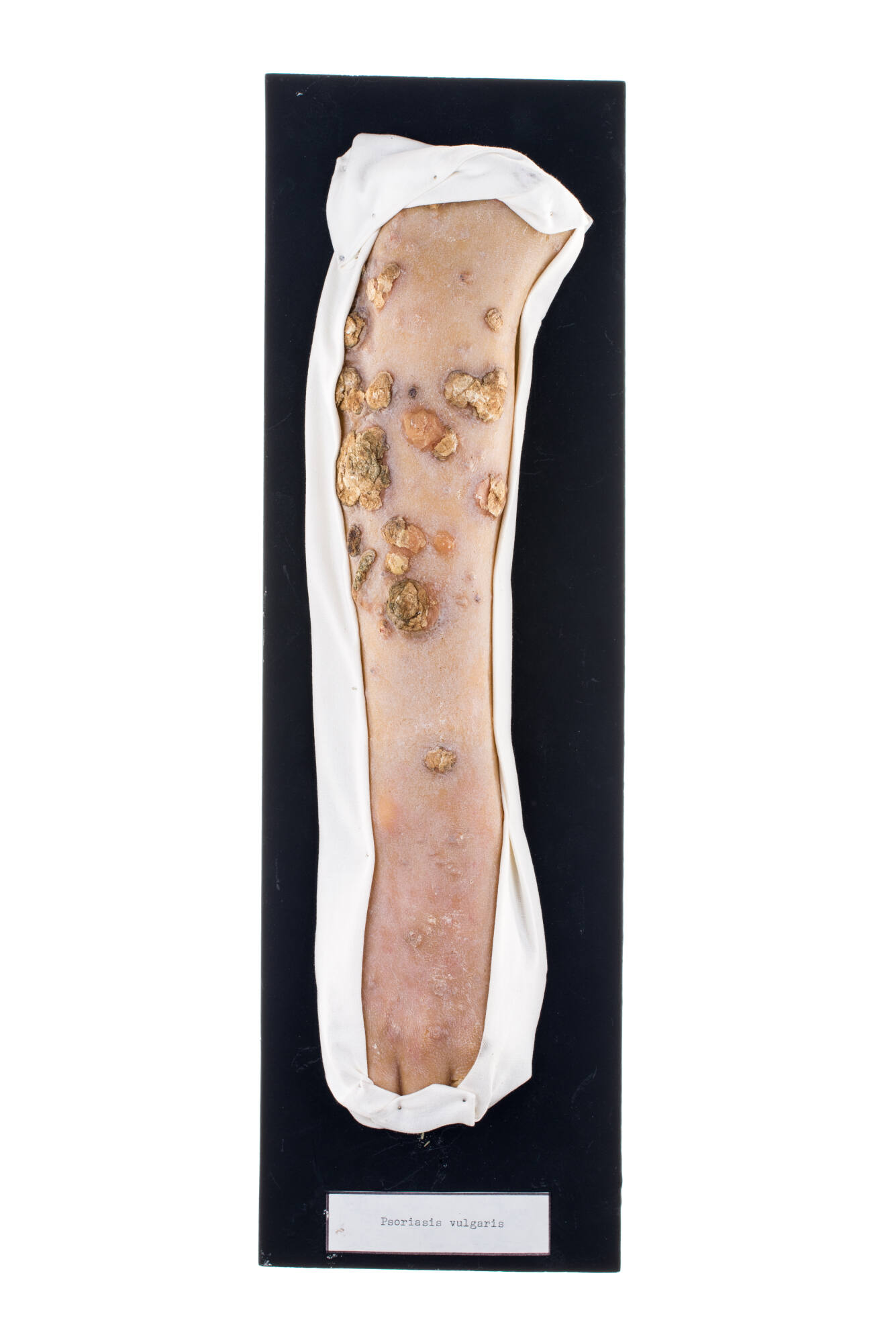 - Psoriasis vulgaris, bzw. Schuppenflechte, am rechten Unterarm mit Hand und Ellbogen