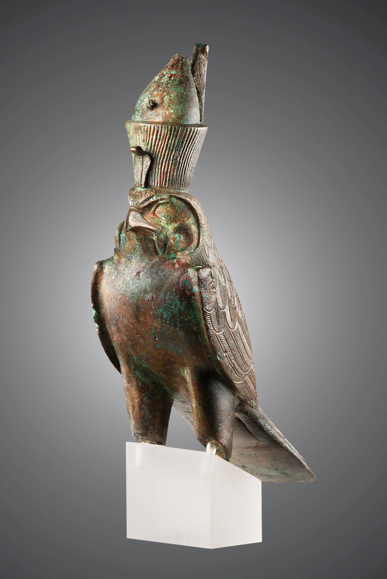DescriptionStehender Falke mit Doppelkrone. Gefieder in Kaltarbeit einziseliert. Die eingelegten Augen sind verloren. Es fehlt die Spitze der Krone und der "Draht", die Beine haben sich nicht erhalten.Wahrscheinlich war diese Bronze keine einfache Votivgabe, sondern diente den Horus-Priestern als Kultobjekt. Sie stand wohl in einer Götterkapelle und erfuhr dort im täglichen Tempelritual Verehrung.DimensionsHöhe: 23,5 cm (235 mm)