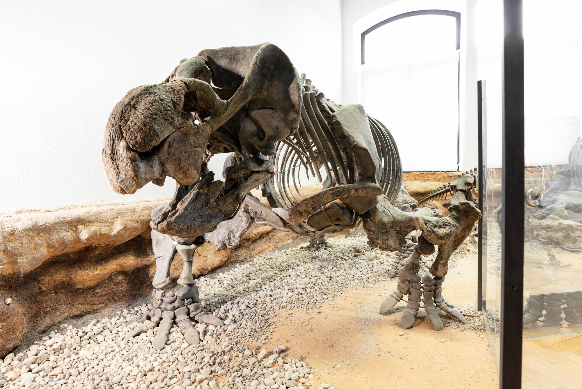DescriptionStahleckeria potens (von Huene 1935) (Synapsida, Anomodontia, Dicynodontia); Mittlere bis Obere Trias, Santa-Maria-Formation, 230 bis 220 Millionen Jahre; Chiniquá bei São Pedro do Sul, Bundesstaat Rio Grande do Sul, Brasilien; Winter 1927/28, ausgegraben durch von Huene und Stahlecker, präpariert und montiert durch Georg Wetzel und Wilhelm Wetzel; Inv.-Nr. GPIT-PV-30792 (syn. PV 19140; GPIT/RE/07106).Zu sehen ist Stahleckeria potens, ein Vorfahr der mordernen Säugetiere. Eines der auffälligsten Merkmale Stahleckerias ist seine Größe, die für Tiere seiner Zeit beachtlich war. Die lebenden Tiere wurden etwa 3 m lang und hatten einen gedrungenen massigen Habitus, ähnlich heutiger Großsäuger wie Nashörner und Flusspferde. Das Skelett zeigt zahlreiche Anpassungen an ein hohes Körpergewicht, speziell sehr kurze, dicke Arm- und Beinknochen. Der Rippenkorb ist voluminös-fassartig ausgebildet. Die ausführliche Beschreibung von Gattung und Art dieses Typus-Exemplars gab der Tübinger Professor Friedrich von Huene 1936 und 1935/42. Es wurde in der Umgebung der Stadt Santa Maria im Staat Rio Grande do Sul in Brasilien auf einer Expedition ausgegraben, die Huene zusammen mit dem namensgebenden Rudolf Stahlecker 1928/29 unternahm.