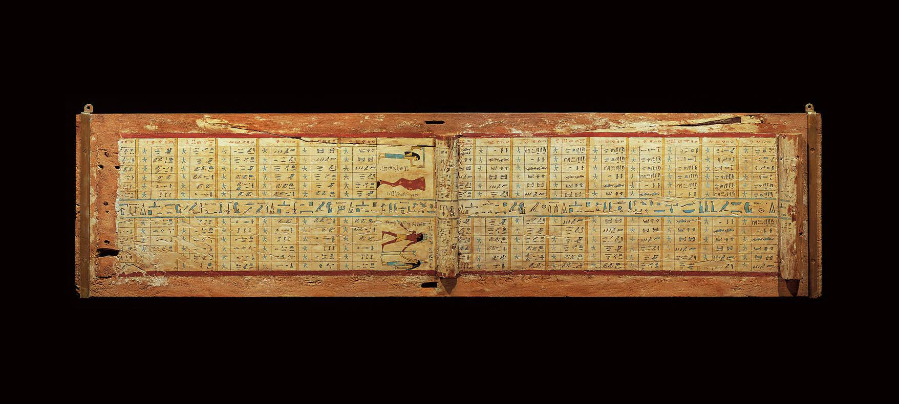 DescriptionKastensarg des Flottenadmirals Idi (Jdjj). Die Sargwanne ist innen und außen verziert mit dem gewöhnlichen Opferformular und den Beigaben für das Jenseits. Die Innenseite des Sargdeckels zeigt eine Diagonalsternenuhr, mit deren Hilfe man die Zeit in der Nacht bestimmen konnte. Der Deckel schließt bündig mit der Wanne.
