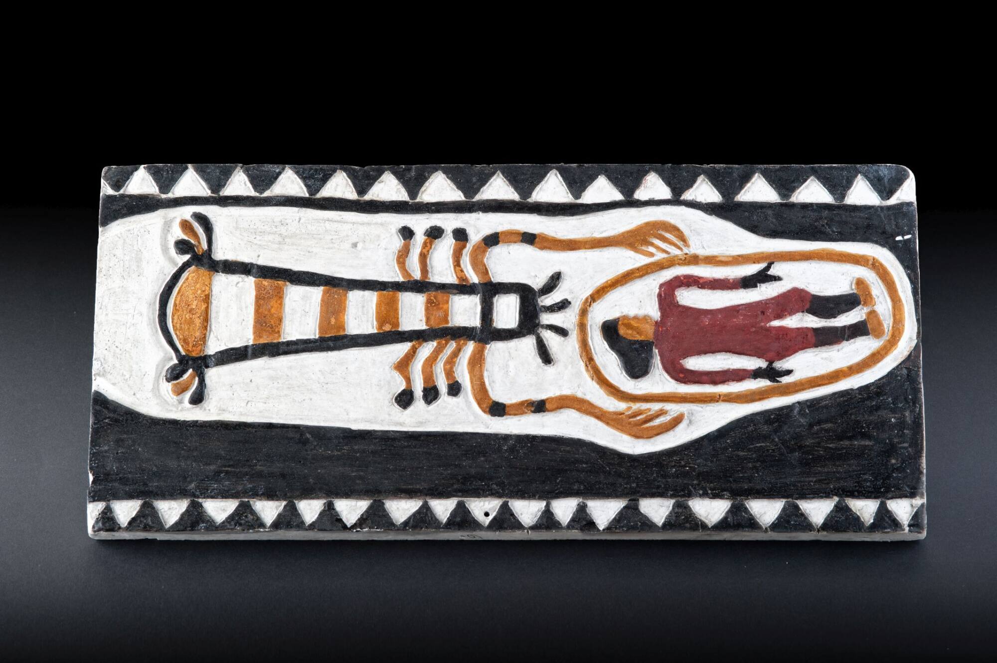 DescriptionDer Abguss zeigt die Bildergeschichte eines angesehenen Mannes. Ein Riesenkrebs mit sehr langen Scheren in Ockergelb und Schwarz zieht den in einem Sarg beigesetzten Mann in die Tiefe. Bildergeschichten wie diese wurden auf den Palau-Inseln nicht nur aus den Planken der Giebelfronten geschnitzt und bemalt, sondern auch aus den Querbalken im Inneren der Häuser.DimensionsH x B x T: 21 × 45 × 2 cm