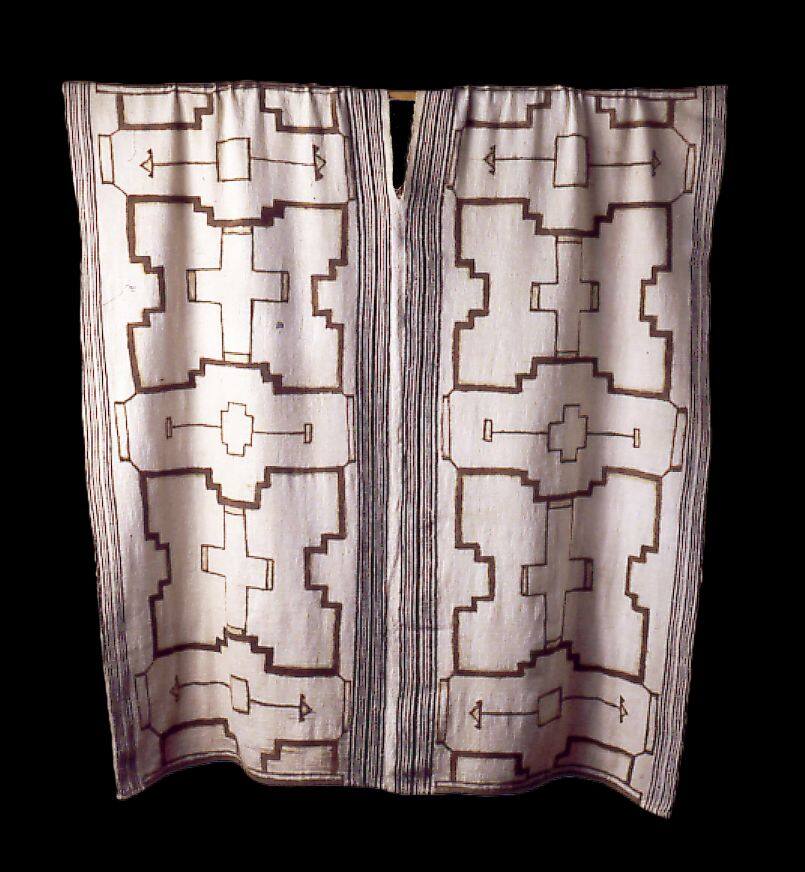 Der Stoff des abgebildeten Männergewandes wurde auf einem „Rückengürtel“-Webgerät handgewebt und dann mit dunkler Farbe aus einem Baumwurzelsud und Ruß mit Ornamenten verziert. Das Gewand gleicht einem Poncho, erhält seine besondere Form jedoch dadurch, dass die Stoffbahnen auch an den Seiten zusammengenäht werden und nur Öffnungen für den Hals und die Arme gelassen werden.