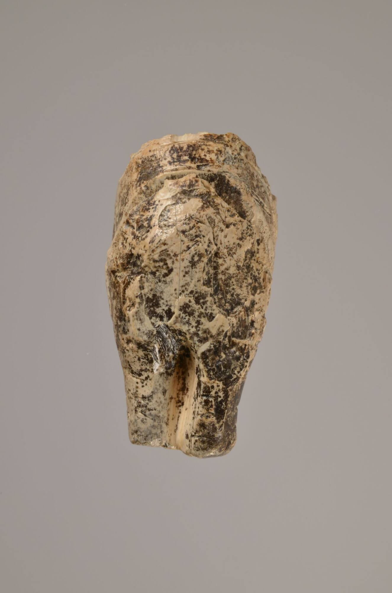 DescriptionDarstellung des Hinterteils eines Säugetieres, vermutlich eines Mammuts. Seine Fußsohlen sind mit Kreuzen verziert. Das Mammut spielt für den Eiszeitmenschen sowohl wegen seines Fleisches und seiner Felle, als auch wegen des Mammutelfenbeins zur Herstellung von Waffenspitzen und Alltagsgeräten eine wichtige Rolle.DimensionsHöhe: 5,5 cm