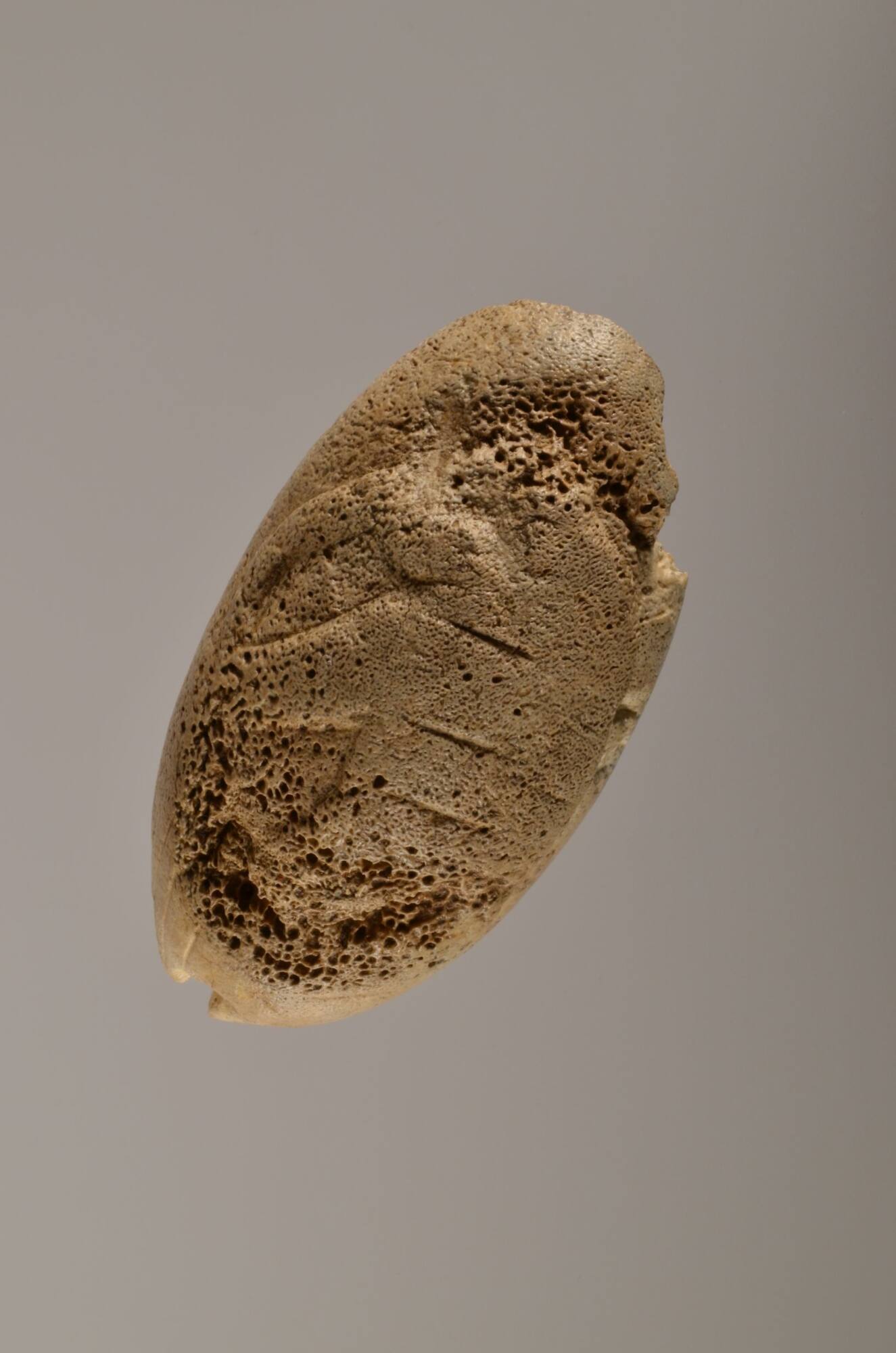DescriptionIm Gegensatz zu fast allen anderen Figuren des Schwäbischen Aurignacien nicht aus Elfenbein, sondern aus Knochen geschnitzt, wie man an dem Schwammgewebe erkennen kann. An einem Ende befindet sich eine ausgebrochene Öse, die die Funktion der kleinen SKulptur als Anhänger belegt. Ursprünglich als Retuscheur, zur Bearbeitung von Steingeräten genutzt.DimensionsLänge: 6,9 cm