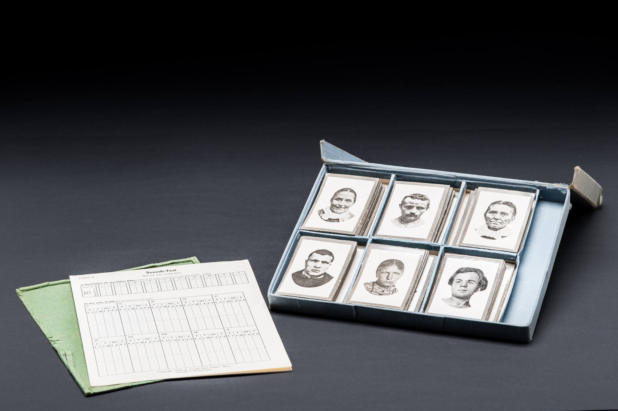 Die Porträts in dieser Leinbandkassette zeigen Menschen mit bestimmten geistigen Krankheiten. Die Theorie, dass deren Triebstruktur durch ihre physiognomischen Gesichtsmerkmale zum Ausdruck gebracht wird, geht auf Leopold Szondi (1893–1986) zurück. Er entwickelte diesen Test zur Diagnose der Triebstruktur im Rahmen der von ihm begründeten tiefenpsychologischen Schicksalsanalyse. Sie besagt, dass die Summe aller Existenzmöglichkeiten eines Menschen durch Wahlhandlungen bestimmt wird. Das kleine Kästchen beinhaltet sechs Serien mit je acht Fotografien, von denen der Proband in mehreren Runden die ihm jeweils sympathischste und unsympathischste Person auswählt."