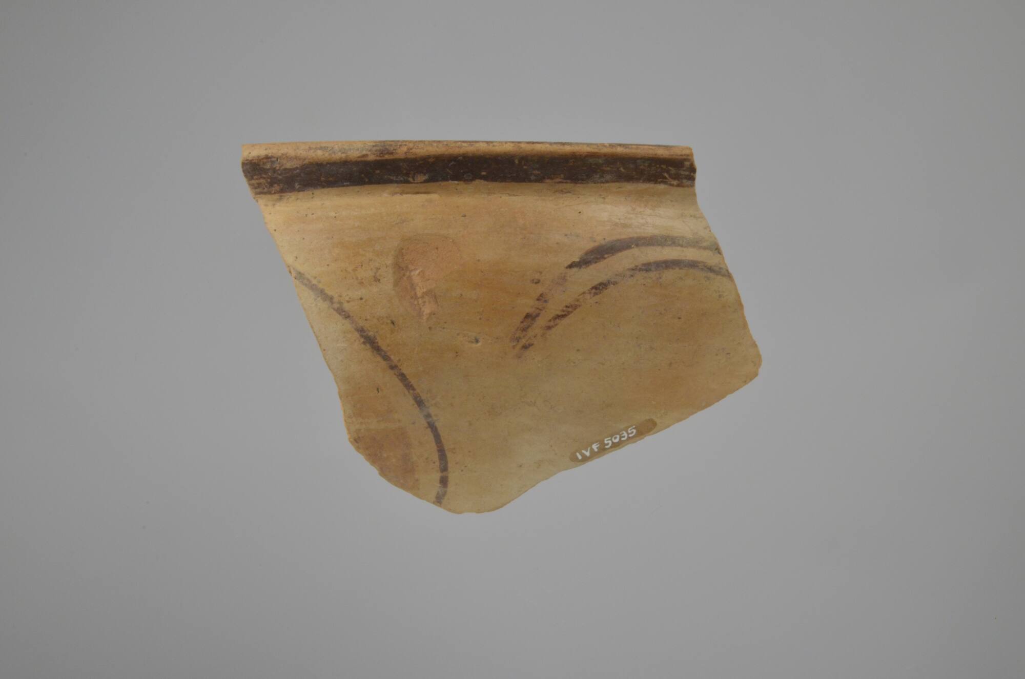 DescriptionCucuteni B Keramik zeigt technologisch nur wenige Unterschiede zur vorhergehenden Kultur A. Die Scherben zeigen jedoch eine insgesamt filigranere Formgebung. Grundlage ist ein feingeschlemmter Ton mit wenigen Einschlüssen, der Brand ist sehr hochwertig. Die Bemalung ist im Gegensatz zur polychromen Typ A- Keramik nur noch zweifarbig. Vorherrschend ist schwarze Farbe auf ockerfarbenem bis rotem Untergrund. Das bevorzugte Ornamentmotiv ist hier eine Strichbandspirale mit Kreisen, Rauten und Spiralen. Neben den Topfscherben finden sich im Inventar der Kultur B auch zahlreiche Becherformen.DimensionsHöhe: 6 cm