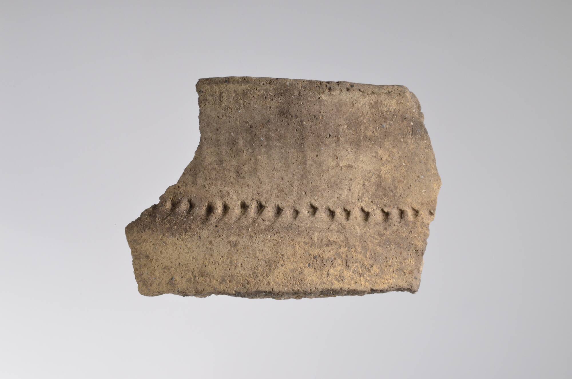 DescriptionDie Keramik der Kultur Cucuteni C ist im Vergleich zu den Vorläuferkulturen an diesem Fundort sehr primitiv. Der verwendete Ton ist verhältnismäßig grob und zeigt viele Einschlüsse von grobem Sand und Kalksplittern. Ebenso ist der Brand weniger hochwertig. Die Oberfläche ist lediglich mit Einritzungen versehen und zeigt weder Bemalung noch Politur. Es stellt sich hier die Frage, warum die ausgezeichnete Technik der vergangenen Kulturstufen geendet hat. Anzunehmen wäre etwa ein Wechsel der Bevölkerung an dem Fundplatz.DimensionsHöhe: 6 cm