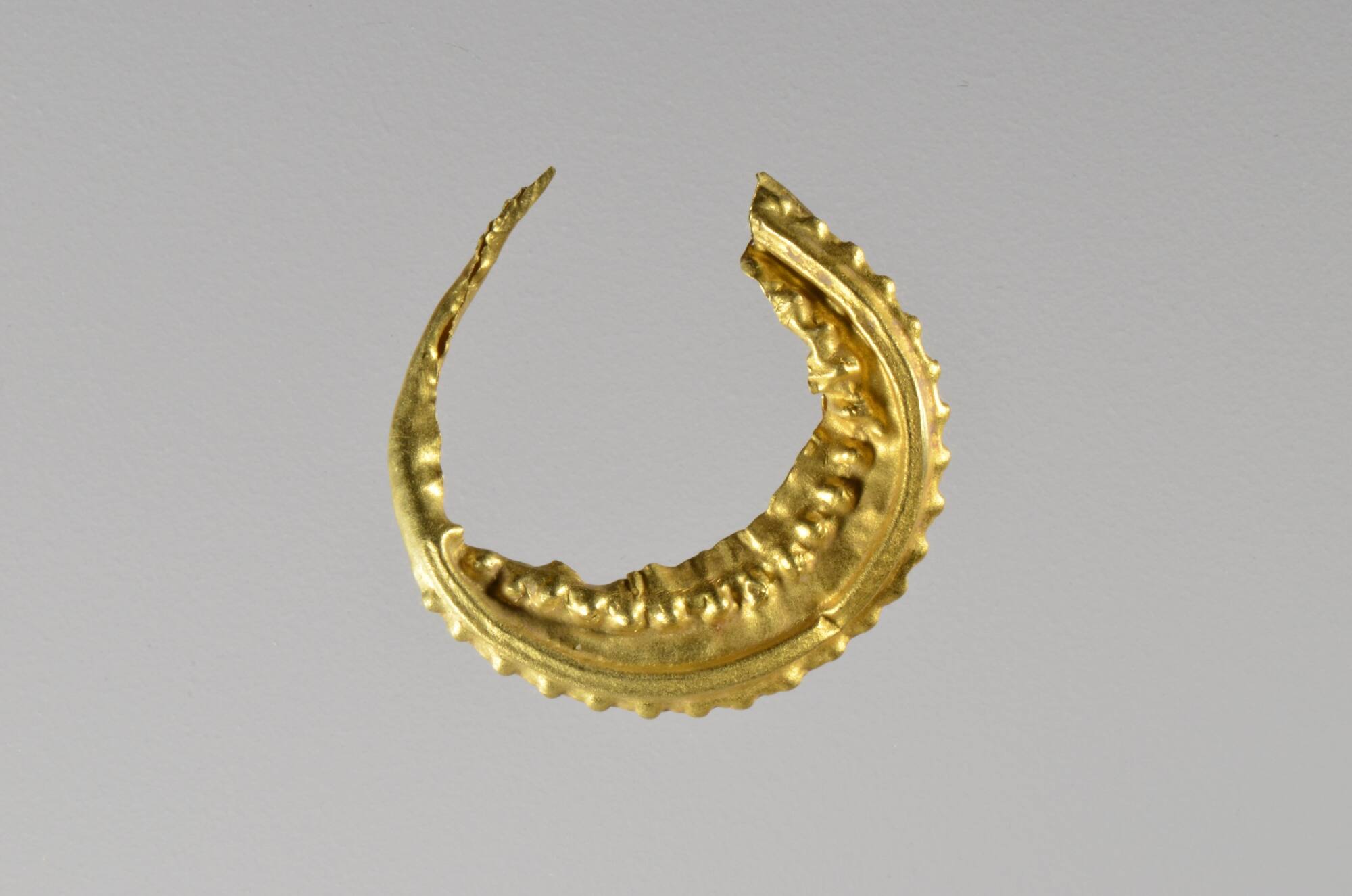 DescriptionEin goldener Segelohrring, verziert mit drei Reihen Perlen, die durch erhobene Rippen getrennt sind. Der Goldohrring wurde gemeinsam mit sieben gleich gestalteten Ohrringen (UFG-Os-3940 – UFG-Os-3946), zwei Bronzeringen (UFG-Os-3947, UFG-Os-3964) und weiteren, inzwischen verschollenen Gegenständen in Grabhügel vier des Gräberfeldes bei Rommelsbach gefunden.DimensionsGewicht: 0,49 g