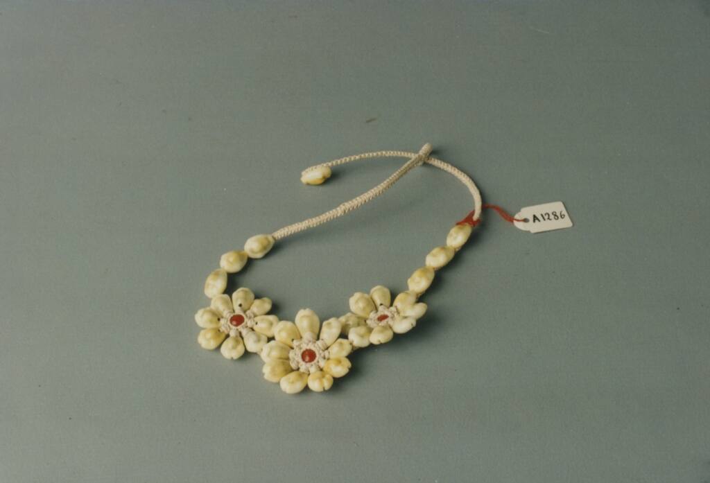 DescriptionDer Halsschmuck "tuilili" aus dem Inselstaat Tuvalu besteht aus drei Rosetten, die nebeneinander auf eine aus jungen weißen Kokosfiederblättern geflochtene Schnur aufgebunden und genäht wurden. Links und rechts im Anschluss an die Rosetten befinden sich auf der Unterschnur jeweils drei der in Tuvalu weitverbreiteten gelb-grau-weißen Kaurischnecken. Auch die Rosetten bestehen aus jeweils acht dieser Schnecken, die ebenfalls mit Kokosfiederblattmaterial um einen roten Fruchtkern durch Flechten und Nähen zusammengefügt wurden.DimensionsL (vom Schneckenverschluß bis zur Öse) x B (mittlere Rosette): 46 × 4,4 cm
