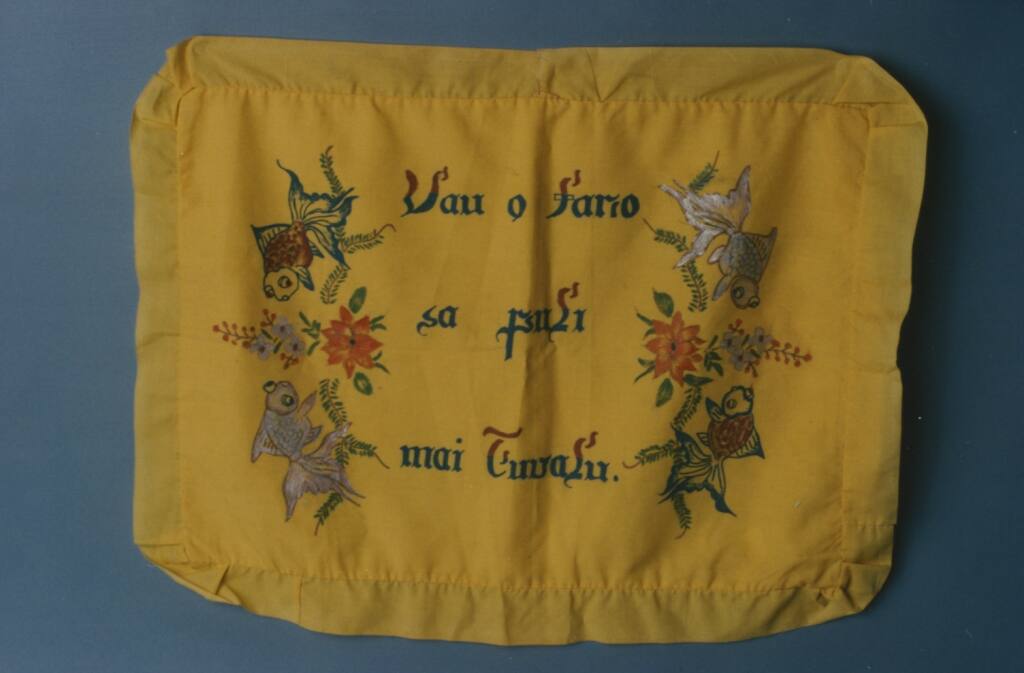 DescriptionDer Kopfkissenbezug besteht aus einem importierten Kunstfaserstoff in kräftiger gelber Farbe. Er wurde mit ebenfalls importierten, relativ waschfesten Textilfarben mit Blumen und Fischen sowie einem Spruch bemalt: "Vau o fano sa puli mai Tuvalu." Übersetzt bedeutet dies frei übertragen: "Fahre weit weg, aber kehre wieder nach Tuvalu zurück."