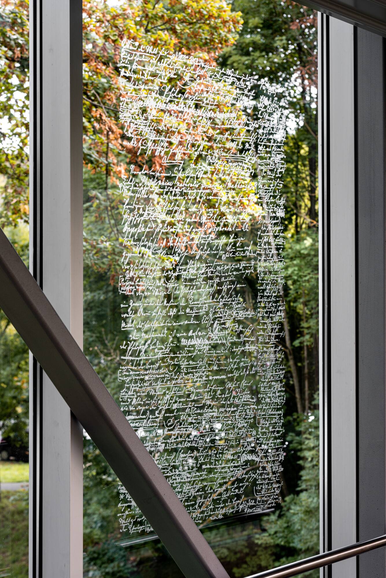 DescriptionDer Künstler Norbert Radermacher ist für seine intervenierende Kunst im öffentlichen Raum bekannt. Dies spiegelt sich auch bei diesem Werk wieder. Am Portal des Bonatzbaus wird der Besucher der Universitätsbibliothek von 12 Bildnissen von Gelehrten und Schriftstellern empfangen, welche da wären Bismarck, Kant, Leibniz, Luther, da Vinci, Platon, Homer, Alighieri, Shakespeare, Goethe, Schiller, Uhland. Der Künstler Radermacher greift die 12 wieder auf und wählte je eine Textstelle aus ihren Werken, die sich mit dem Thema Fluss, Fließen, Brücke oder Übergang beschäftigen. Damit schafft er eine metaphorische Brücke zwischen Altem und Neuem, Schrift und Bild. Der Schriftzug aus hellem Grau fügt sich nahtlos in die Landschaft ein. Standort: Universitätsbibliothek Tübingen, Wilhelmstraße 32