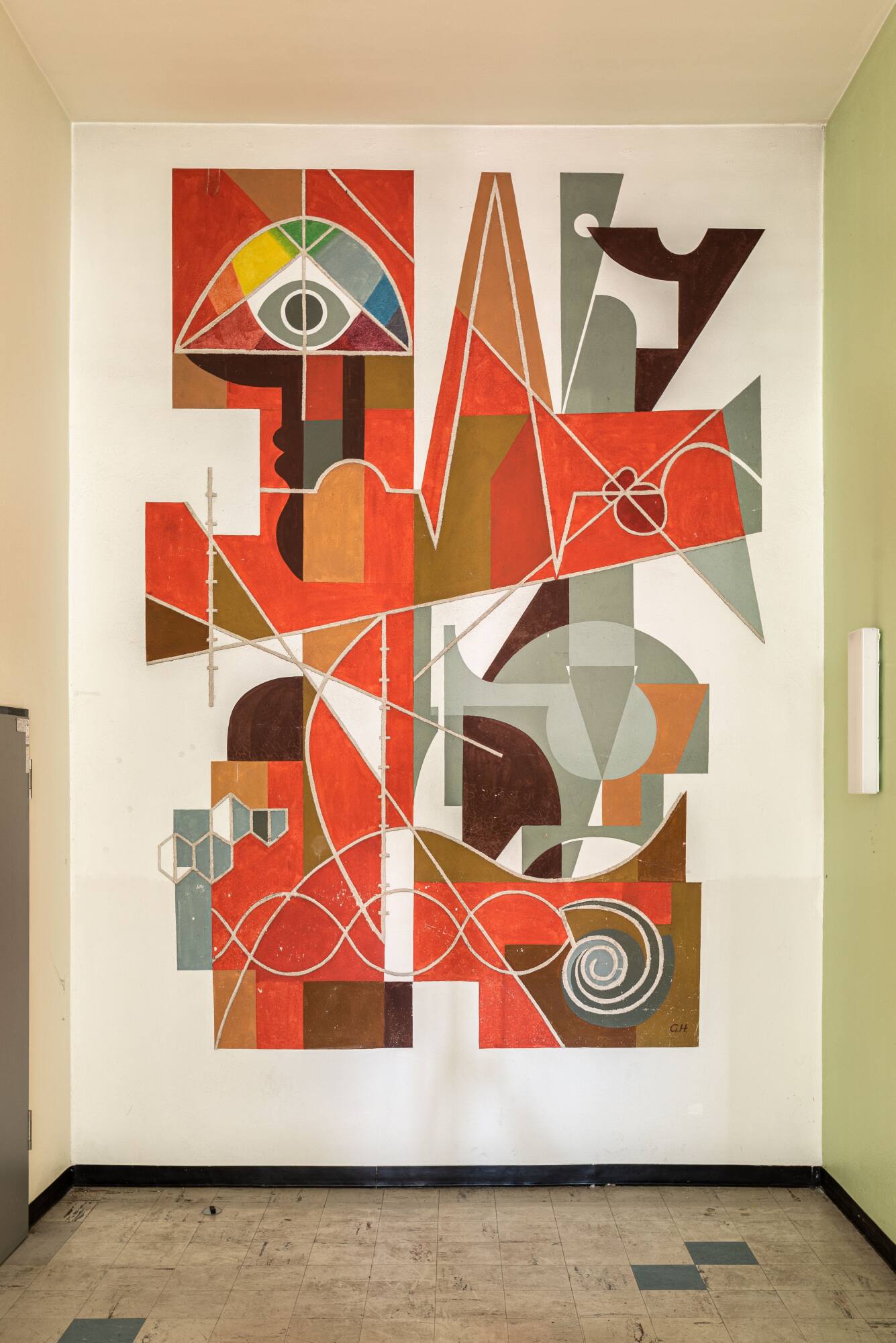 DescriptionDas Wandbild stammt aus dem Jahr 1958 und ist auf Putz gemalt, die gliedernden Bildelemente sind in Sgraffito-Technik ausgeführt. In Hildebrands Werk lassen sich zeichenhaft dargestellten Motive, wie Auge, Herz, Molekularebene und Ohr erkennen. Andere Bereiche bleiben unklar und dienen eher der illustrativen Wandflächengliederung.Standort: Zentrum für empirische Bildungsforschung (ZEB)/ ehemals “Altes Physiologisches Institut“, Gmelinstraße 5