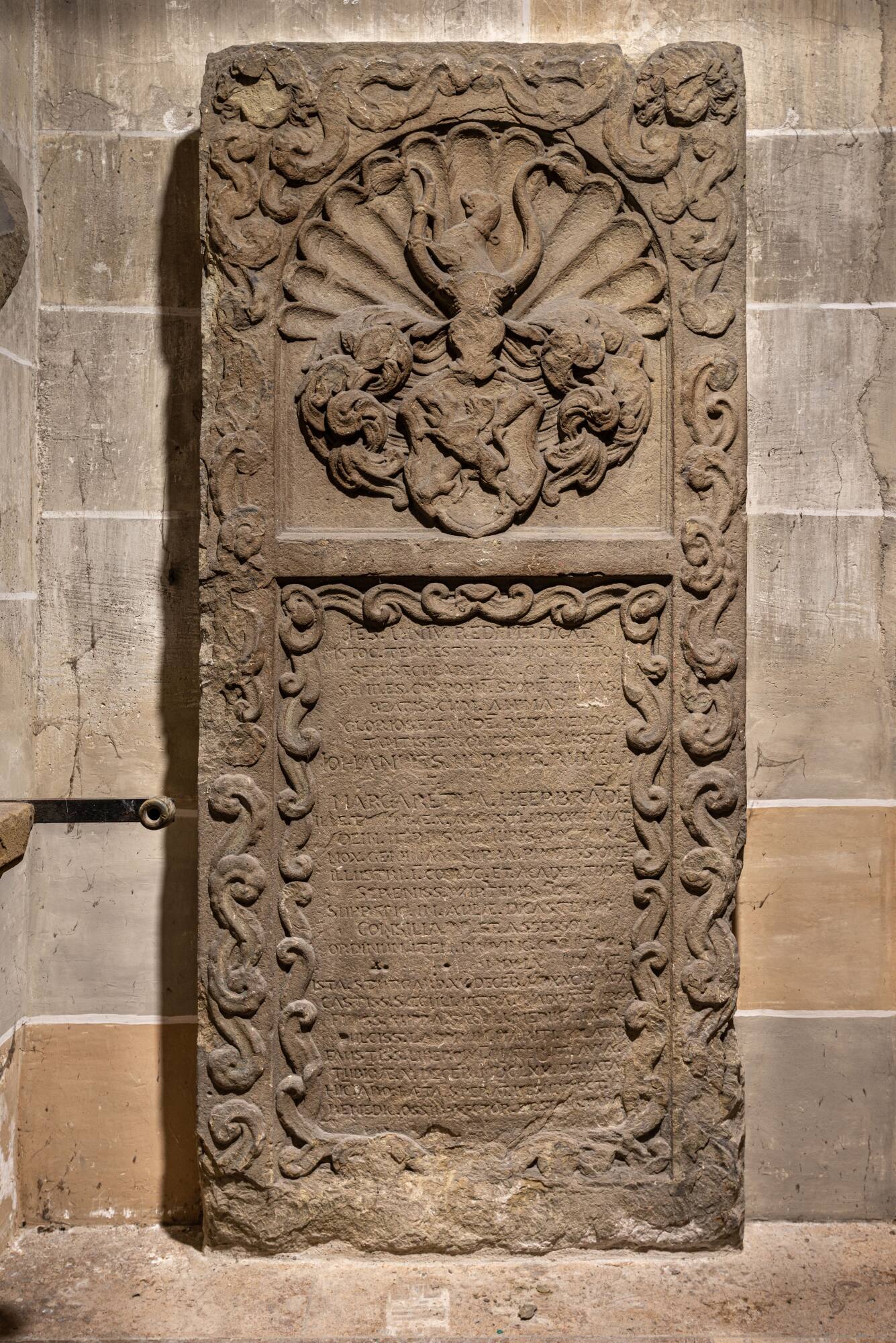 DescriptionMehr ornamentalen Schmuck zeigt das Grabmal des Professors Johann Ulrich Rümelin (1582–1670) und seiner Ehefrau Margarethe, geborene Heerbrand, in der südwestlichen Ecke der Vorhalle, am Emporenaufgang. Nach dem Studium in Tübingen und der Promotion zum Doktor beider Rechte hatte Johann Ulrich Rümelin zuerst die Professorenstelle am Collegium Illustre erhalten. 1632 wurde er dazu noch Professor an der Universität. 152 Der ursprüngliche Platz des Grabmals ist bekannt – es befand sich außen an der Südwand der Kirche.Standort: Stiftskirche Tübingen, Vorhalle, Südwest-Ecke