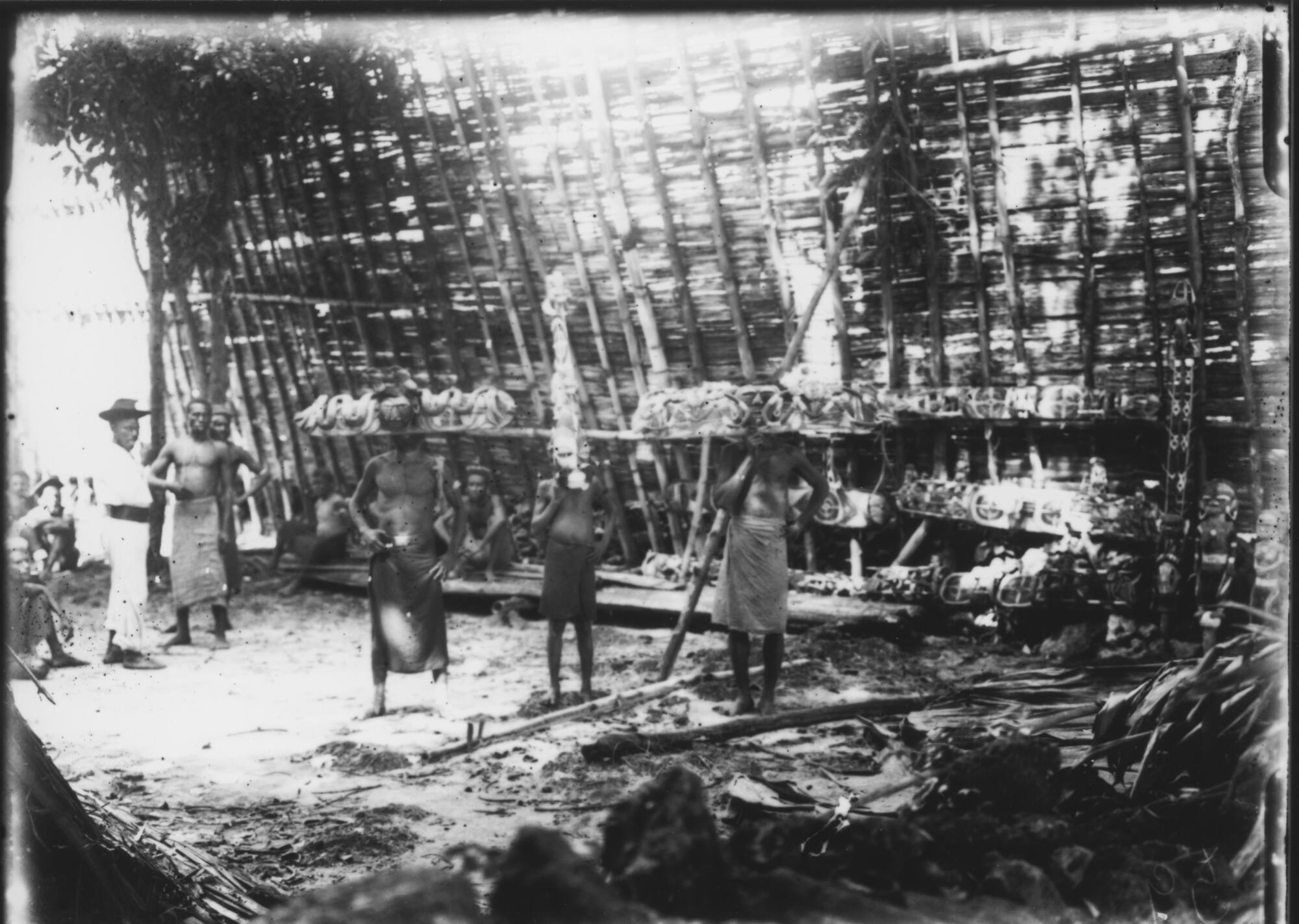 DescriptionAugustin Krämer beschreibt dieses Bild in seinem Band "Die Malanggane von Tombara" (1925) als "Malangganhof mit hohem Zaun in Hámba" und fügt dem hinzu: "Die Málanggane sind zum Photographieren zusammengebracht." Deutlich wird in diesem Zusammenhang die Inszenierung von Fotografie, auch im dokumentarischen Kontext. Im Vordergrund stehen drei Maskenträger. Mittig ist eine hohe Maske des Malanggan-Schnitzers Téringa von Hámba zu sehen. Gesäumt wird diese Maske von breiten Malanggan-Masken mit Schlangen verziert.