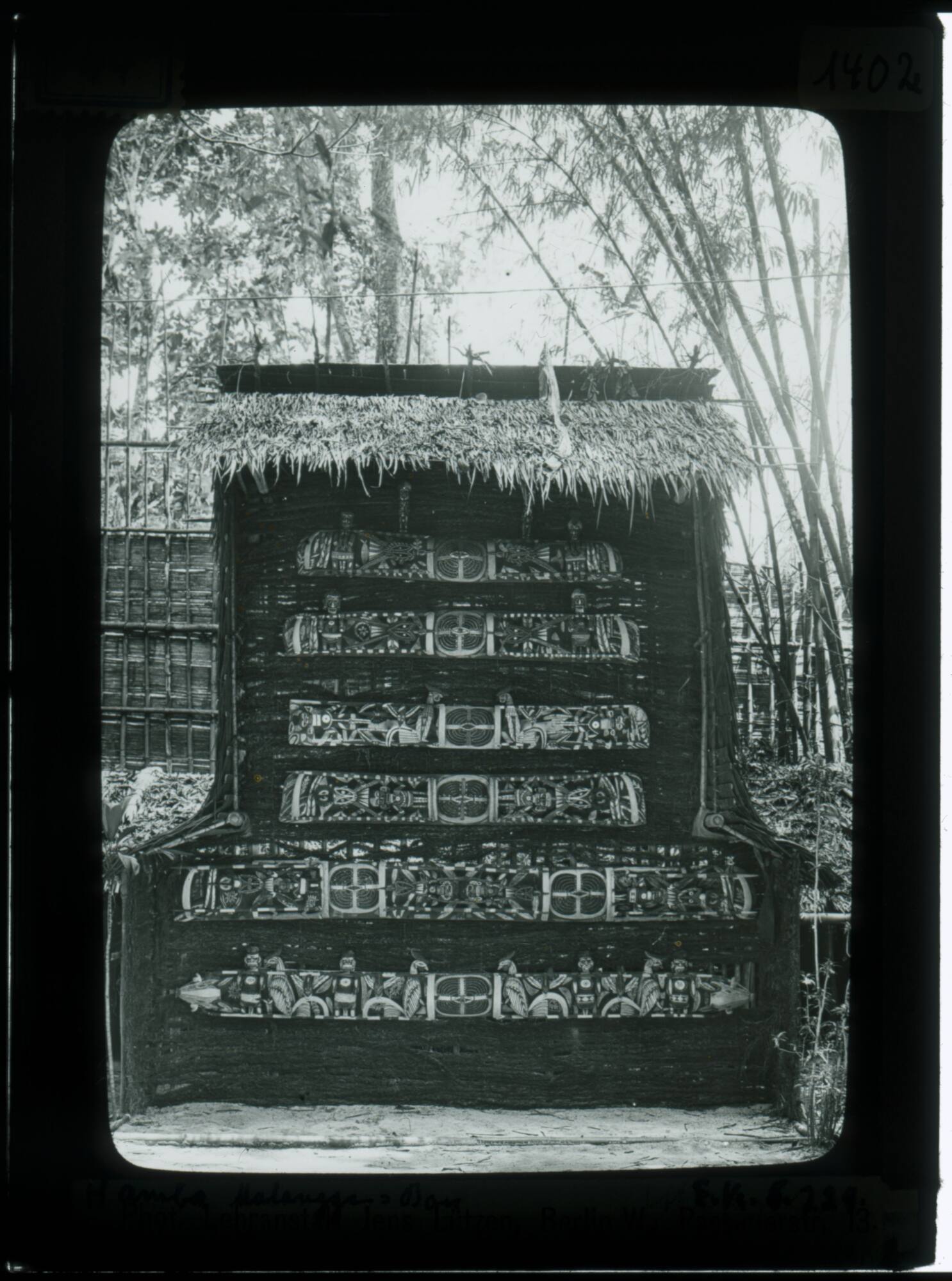 DescriptionIn einem Malanggan-Haus in Sibénmalum, Léssu, Neuirland sind Malanggane in Friesform "ualik" in ihrer ursprünglichen Anordnung zu sehen. Die ersten beiden kleineren Malanggan-Friese werden laut Augustin Krämer, dem Holzschnitzer Mangap von Léssu zugeschrieben. Das darauffolgende dritte Malanggan-Fries wurde vermutlich von dem Schnitzer Lélava aus Hámba hergestellt.Fotografische Dokumentation während der "Deutschen Marine-Expedition 1907-1909", vermutlich von Richard Schilling.