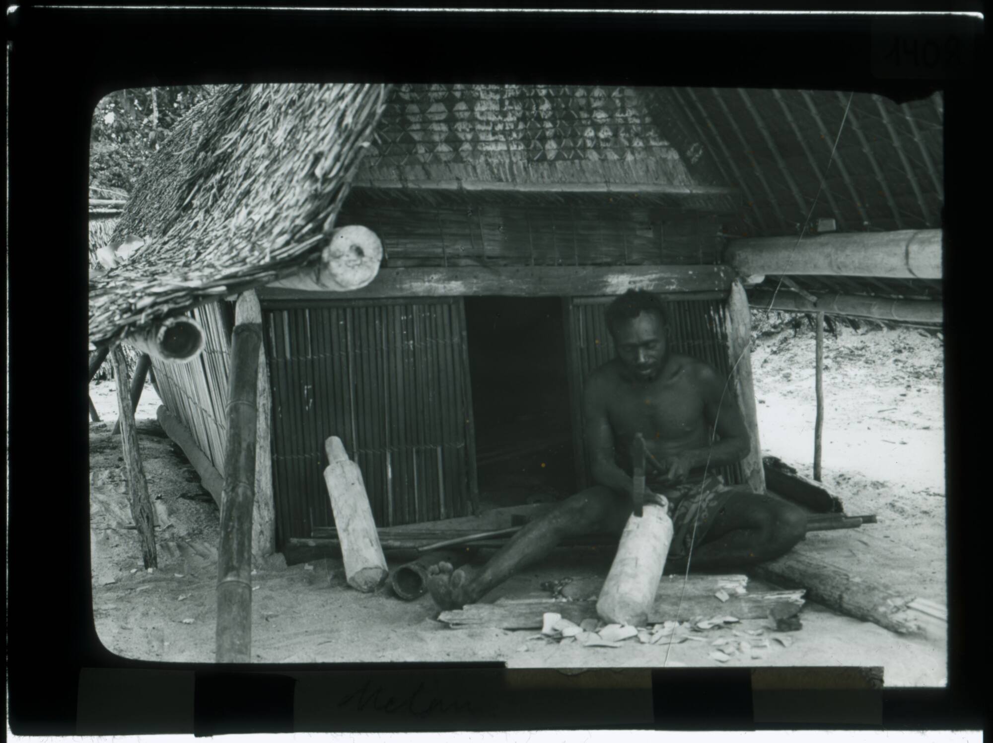 DescriptionIn den Aufzeichnungen von Elisabeth Krämer-Bannow und Augustin Krämer wird der Schnitzer im Bild namentlich als Téringa aus Hámba erwähnt. Zu dieser Szene, die während der Deutschen Marine-Expedition im Februar 1909 aufgenommen wurde, schreibt Elisabeth Krämer-Bannow nachträglich: "Der Malanggan-Schnitzer Teringa hatte sich bereit erklärt, vor unseren Augen eine kleine Figur zu schnitzen. Es war eine Ausnahme und geschieht sonst nicht. In Zeitabschnitten, die jedesmal Anlaß zu Festen geben, wird ein malanggan von einem Stadium zum anderen geschnitzt, bis es schließlich fertig bei der Hauptfeier zu Ehren Verstorbener ausgestellt wird" (Krämer-Bannow 1916: 146). Fotografische Dokumentation während der "Deutschen Marine-Expedition 1907-1909", vermutlich von Richard Schilling.