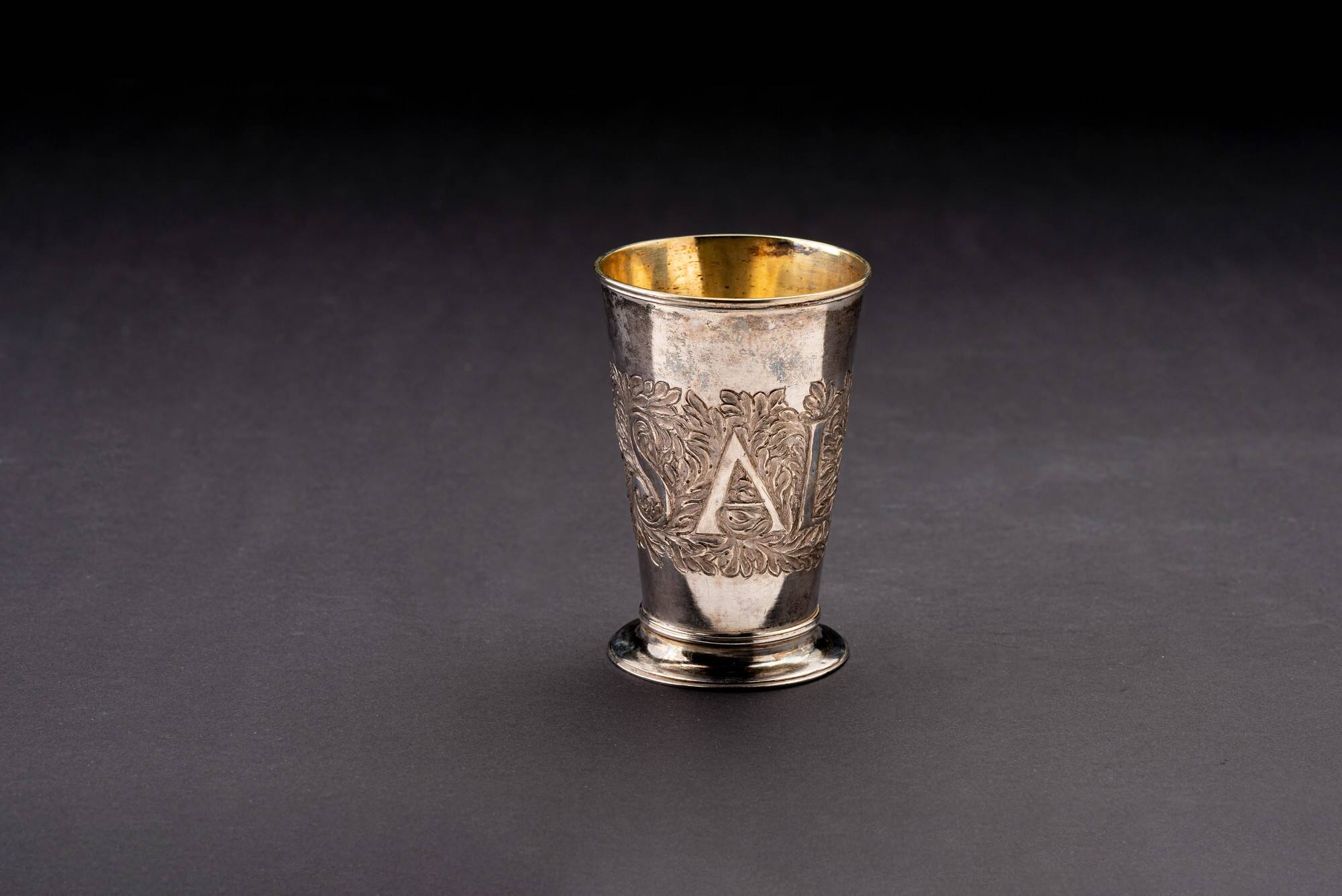 DescriptionDer Becher wird von der Umschrift "Saluti", die in getriebenes Laubwerk eingebettet ist, wie von einem Gürtel umschlossen.DimensionsHöhe: 11,2 cm